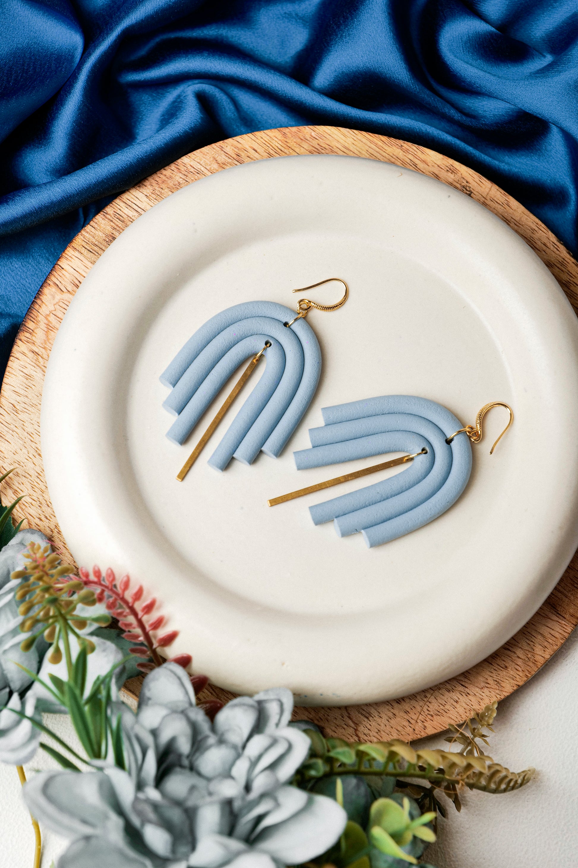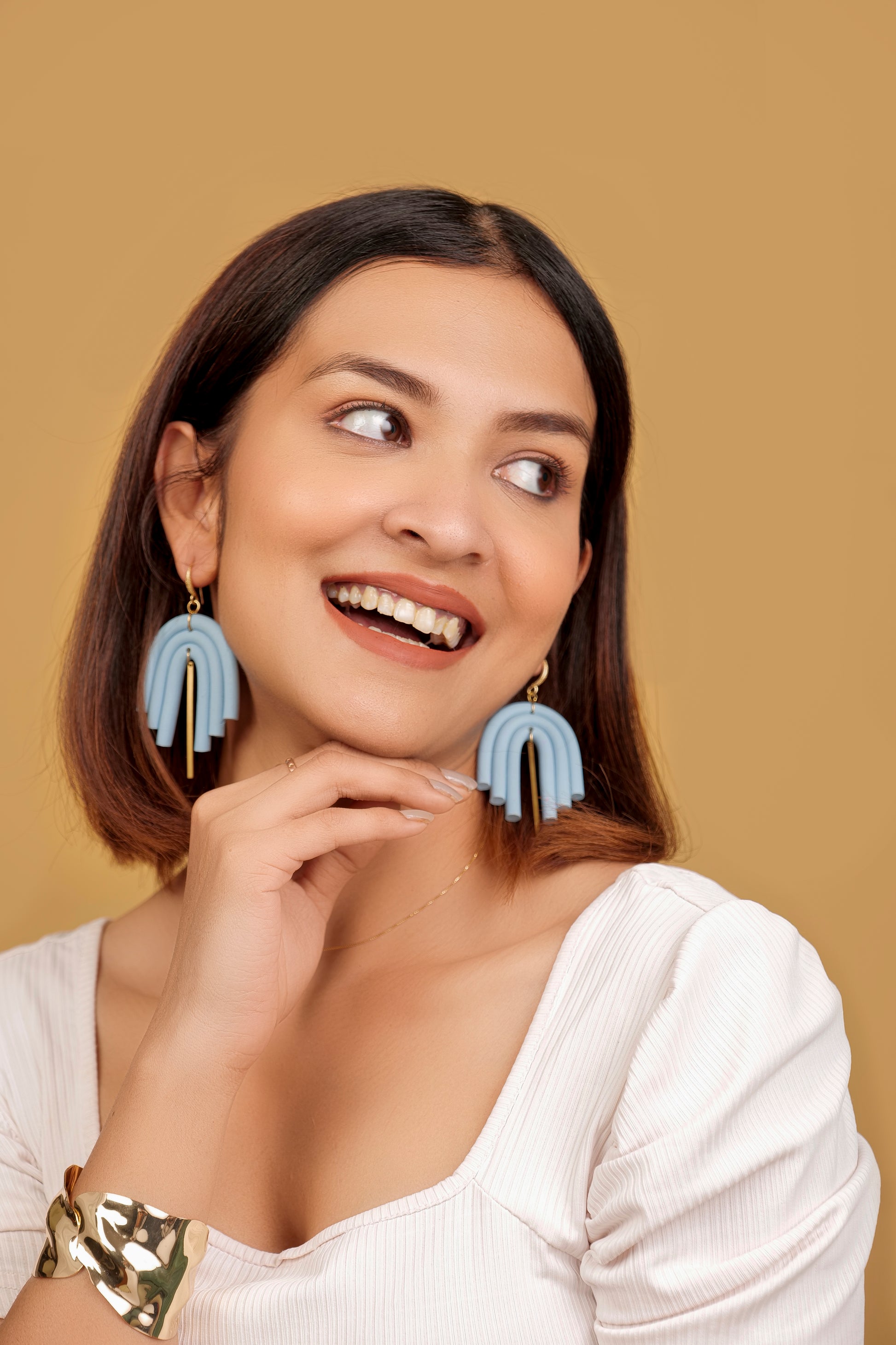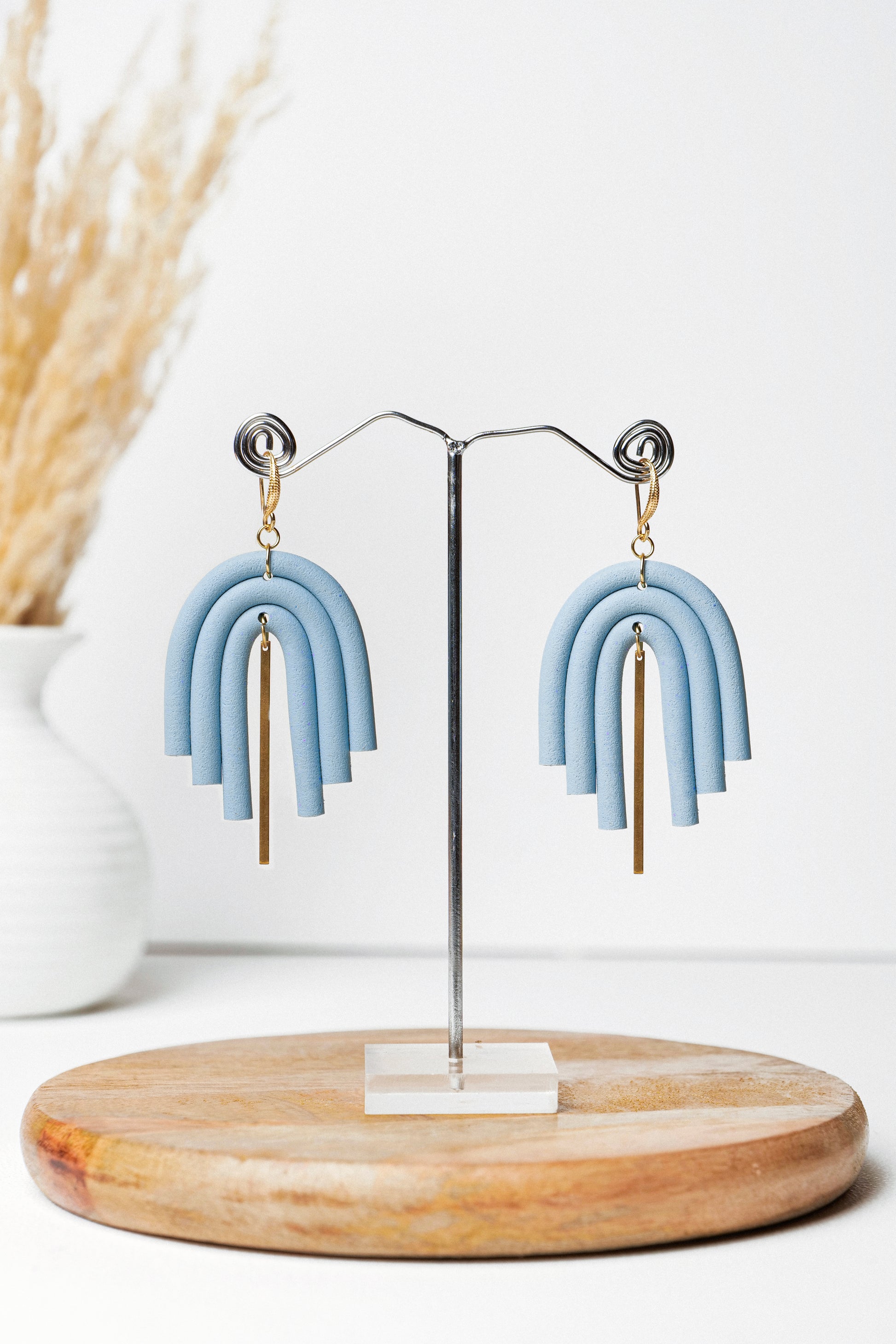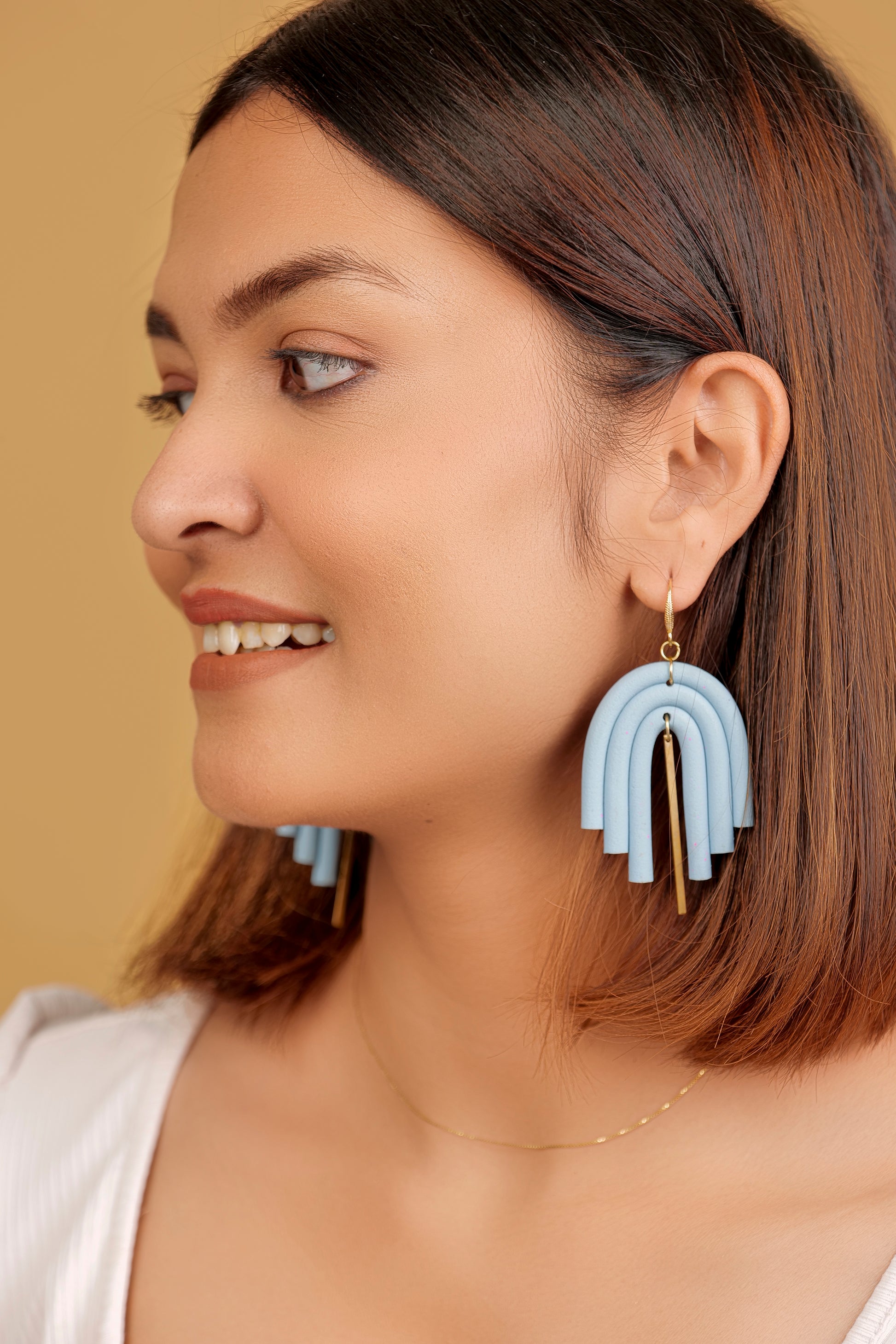 These sky-toned dangles offer a refreshing twist with their layered arch structure and elegant gold drop detailing. The soft blue polymer clay lends a calm, dreamy vibe, while the gold adds just the right touch of luxe to elevate your outfit effortlessly.