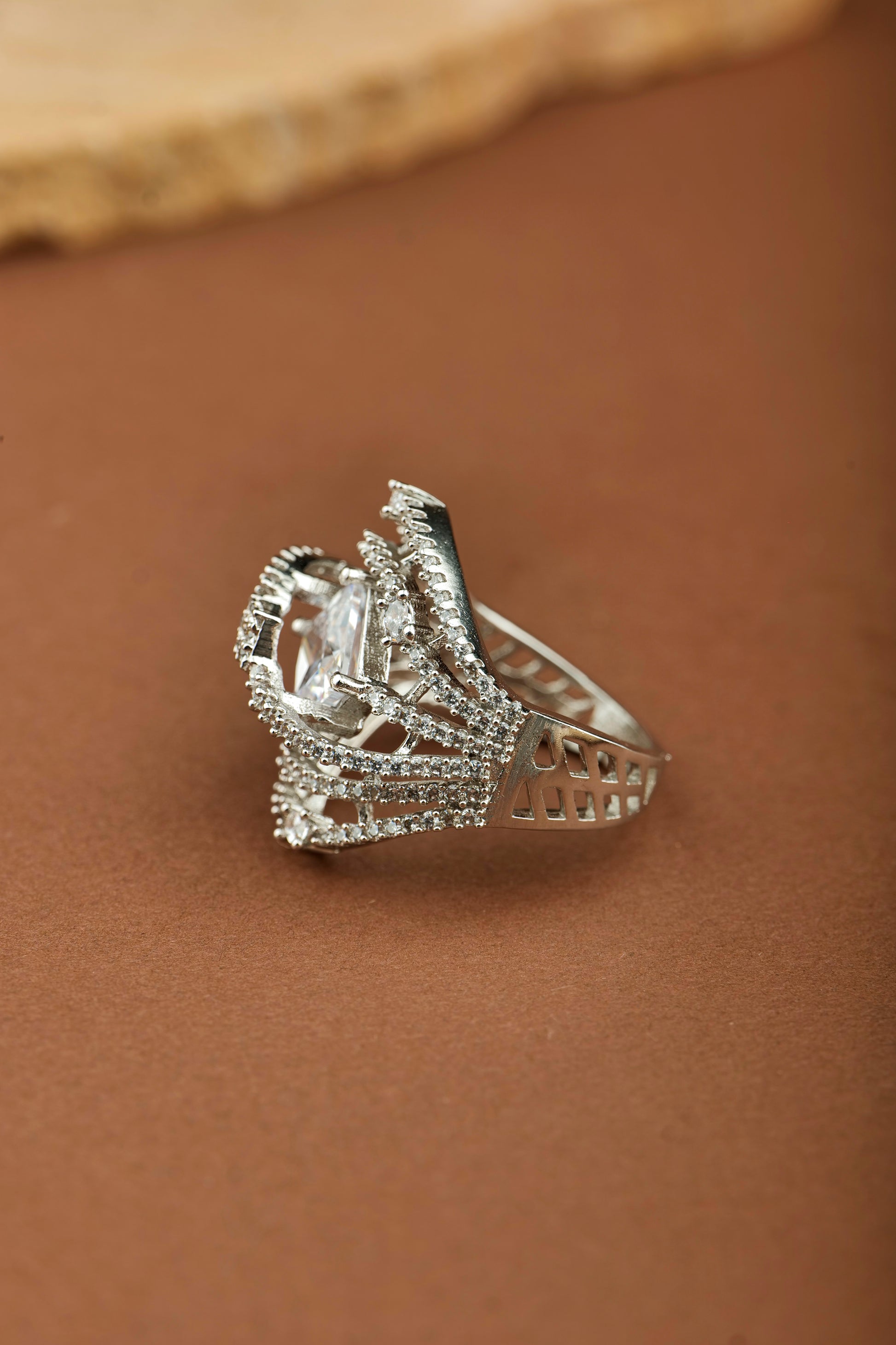 An intricate statement ring featuring a radiant square-cut stone at its center, framed by delicate wave-like rows of sparkling American diamonds. The unique openwork design adds lightness while keeping a luxurious feel, making it perfect for special occasions. Crafted from stainless steel, it is waterproof and anti-tarnish for long-lasting shine.