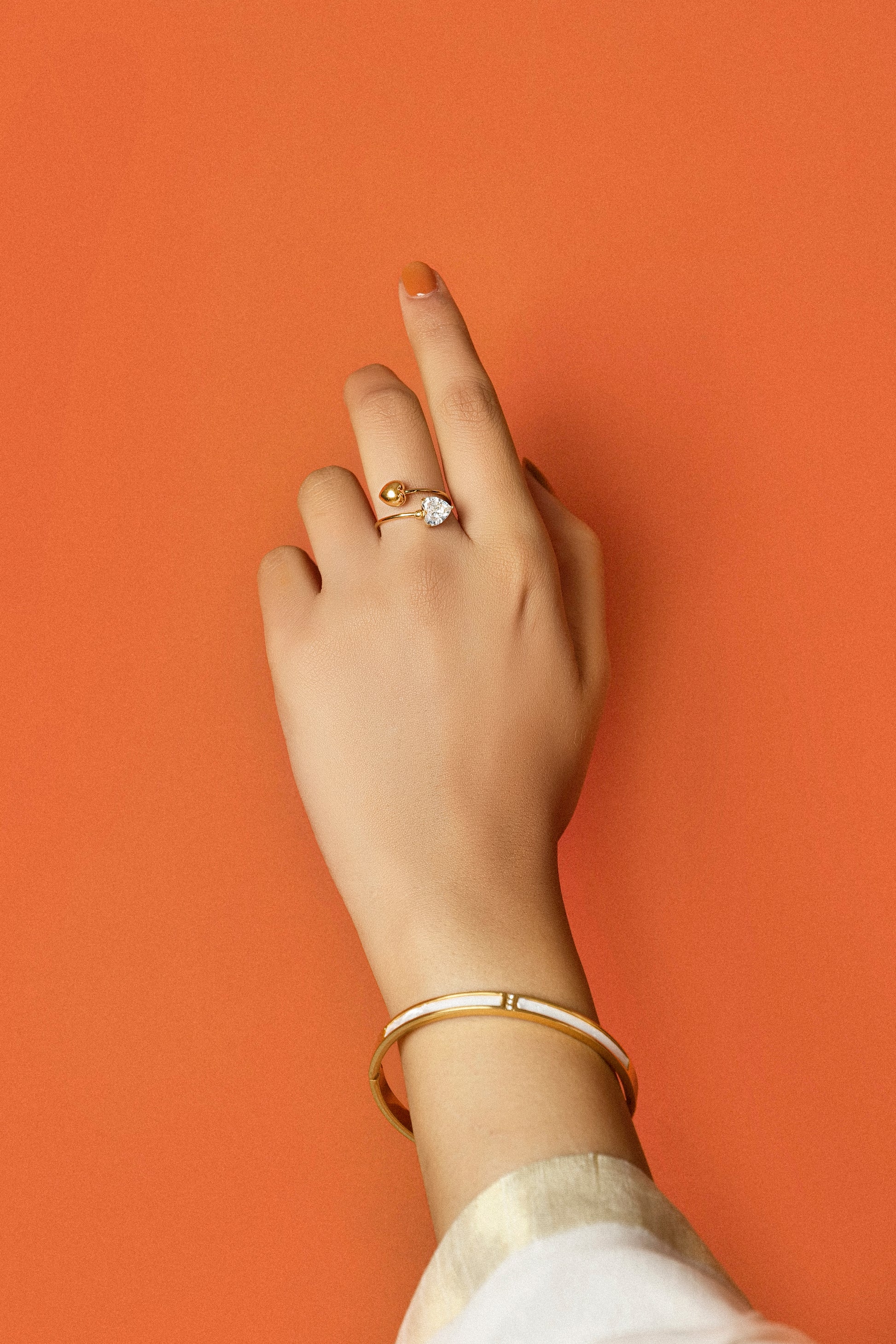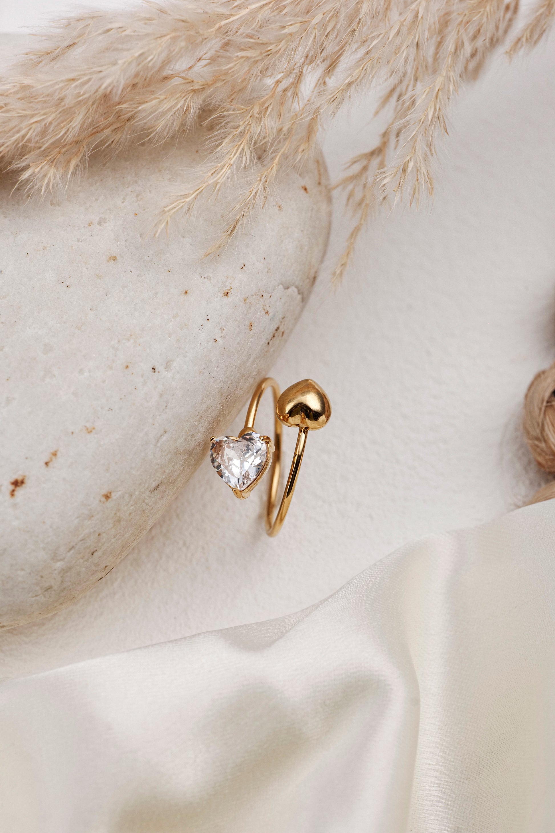 Crafted from a premium brass base with a waterproof coating, this elegant adjustable ring features a sparkling heart-cut cubic zirconia paired with a sleek golden heart accent. A romantic and versatile piece perfect for adding a subtle statement to any look.