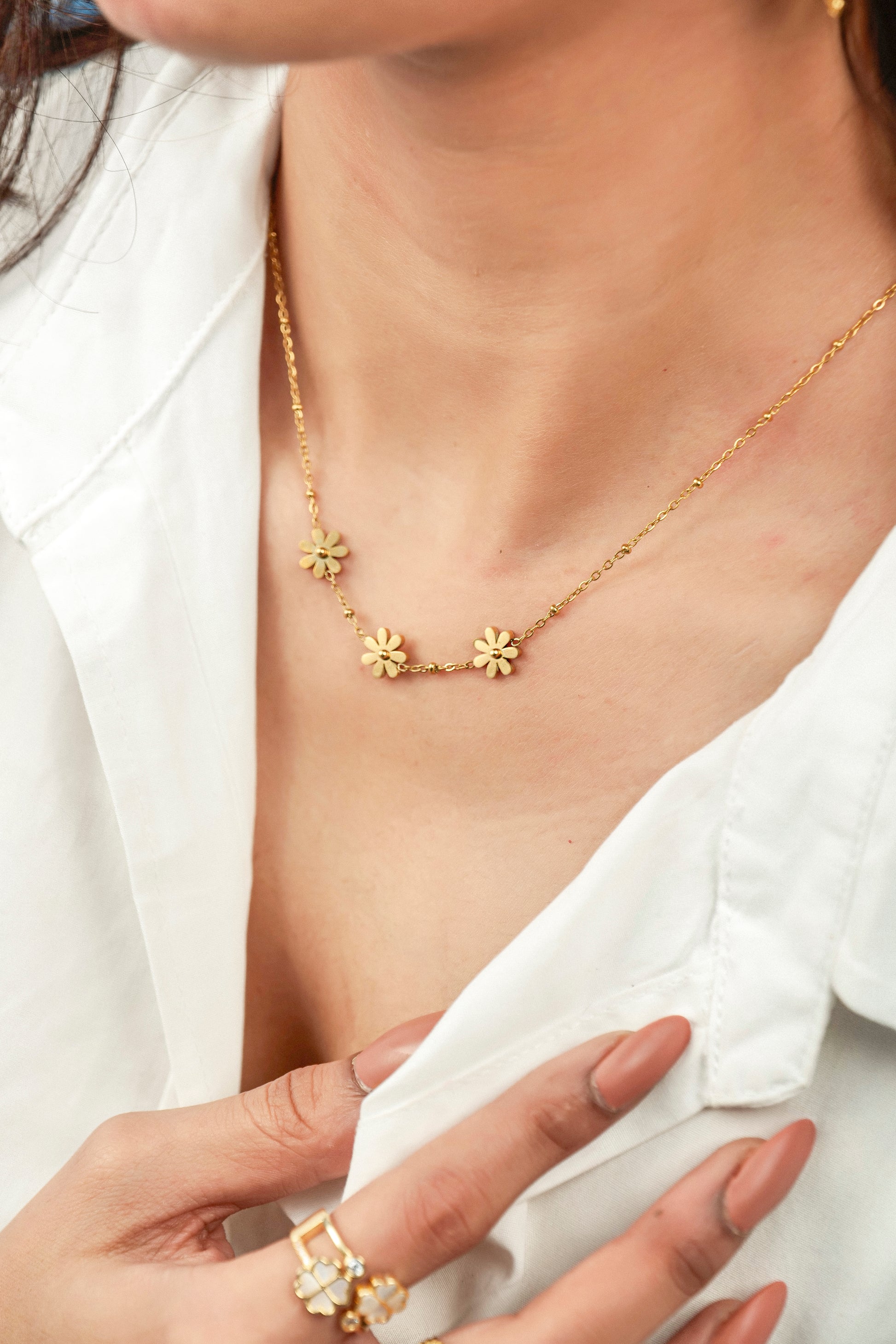 A sweet and simple necklace with three dainty daisy charms. Daisy Shine is 18k gold-plated, water-resistant, and gentle on the skin. A perfect pick for everyday wear with a touch of charm.