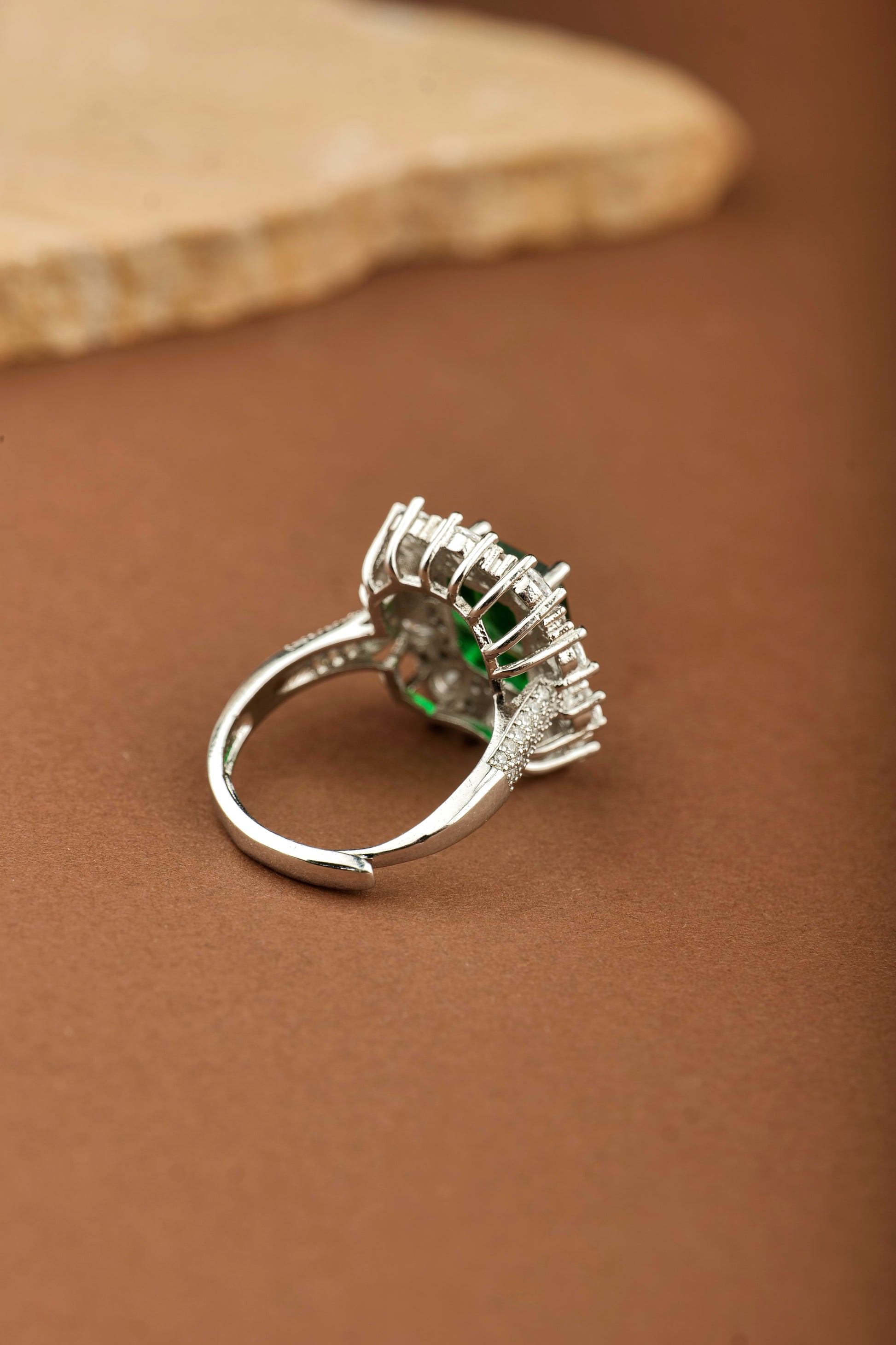 A bold square-cut green stone takes center stage, encircled by a stunning halo of pear-shaped and round American diamonds. Set in stainless steel with a detailed diamond-studded band, this ring radiates timeless elegance.