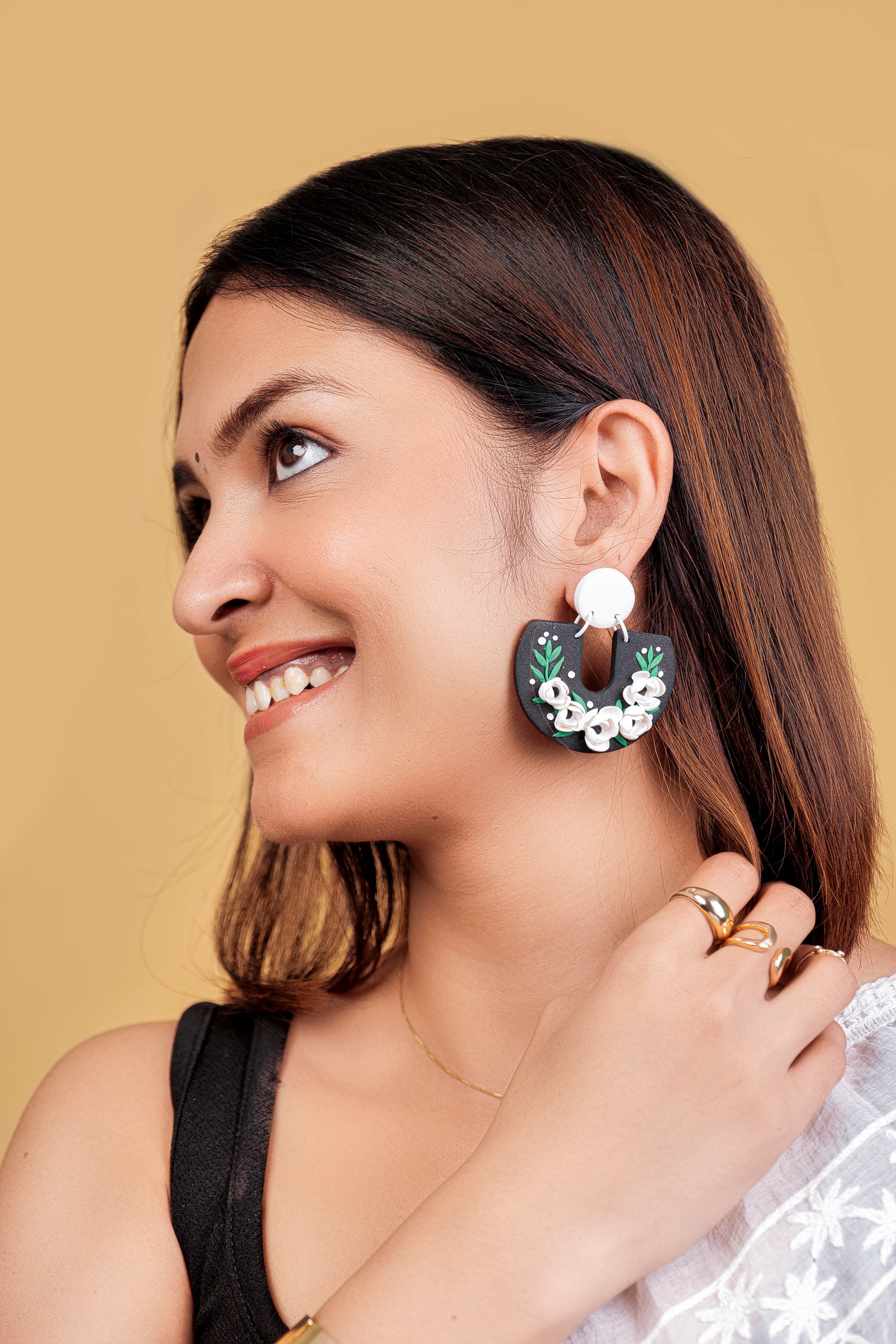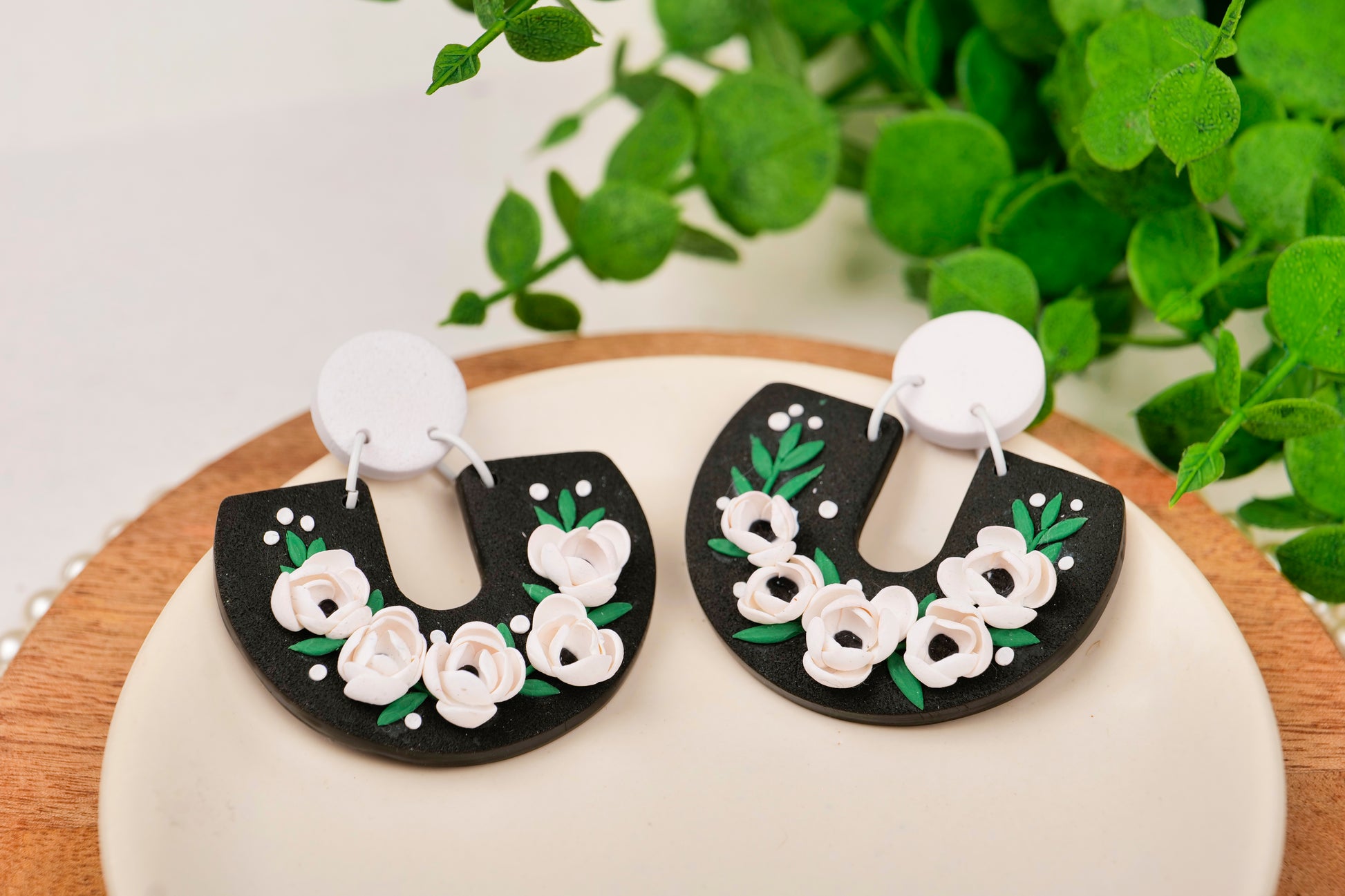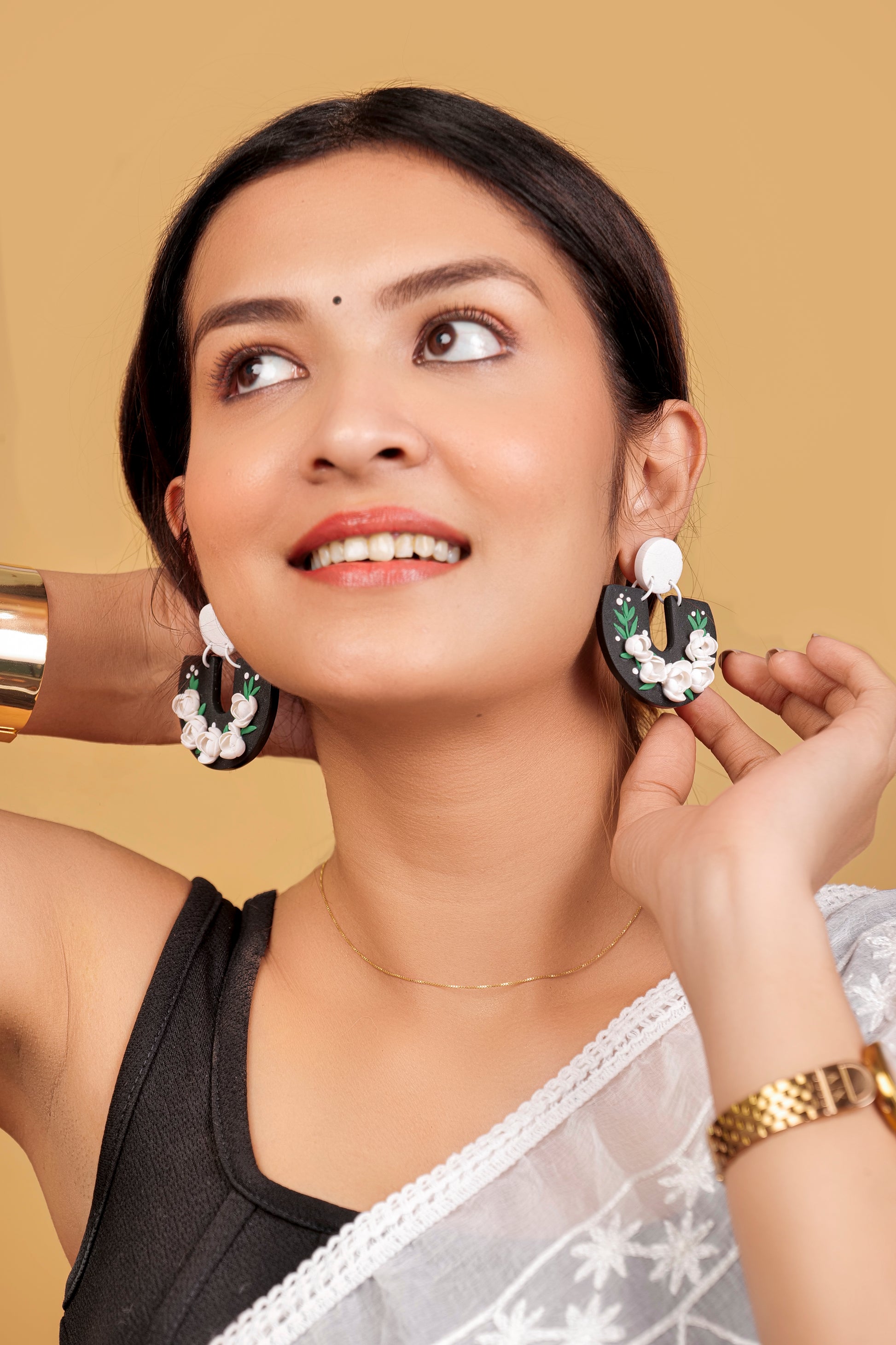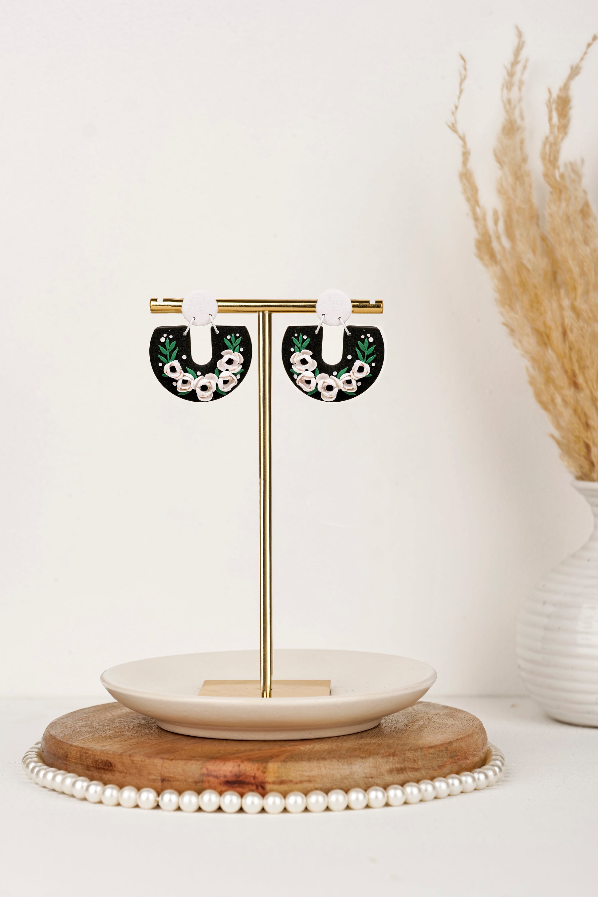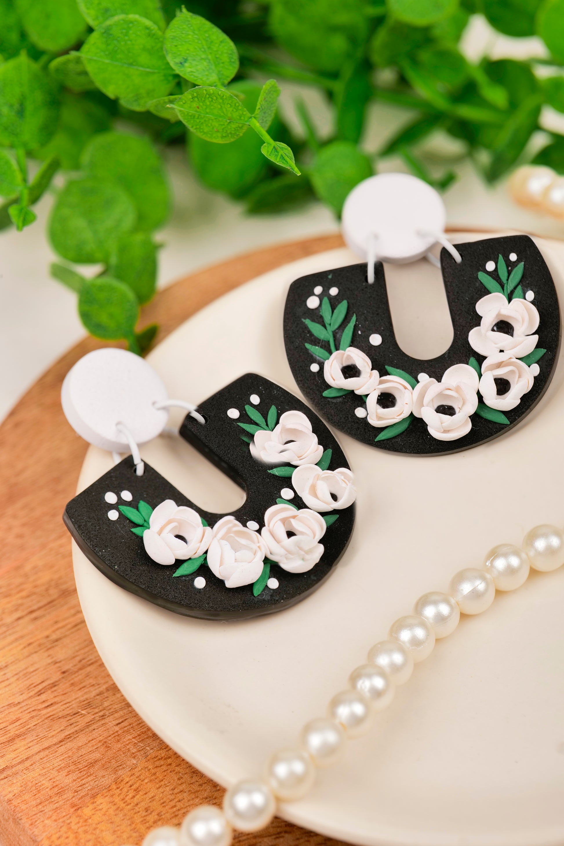 Handcrafted floral arches with soft white roses and leafy greens on a bold black base. These earrings are perfect for day looks โ style them with printed scarves, summer cottons, or earthy tones for a refreshing pop of nature.