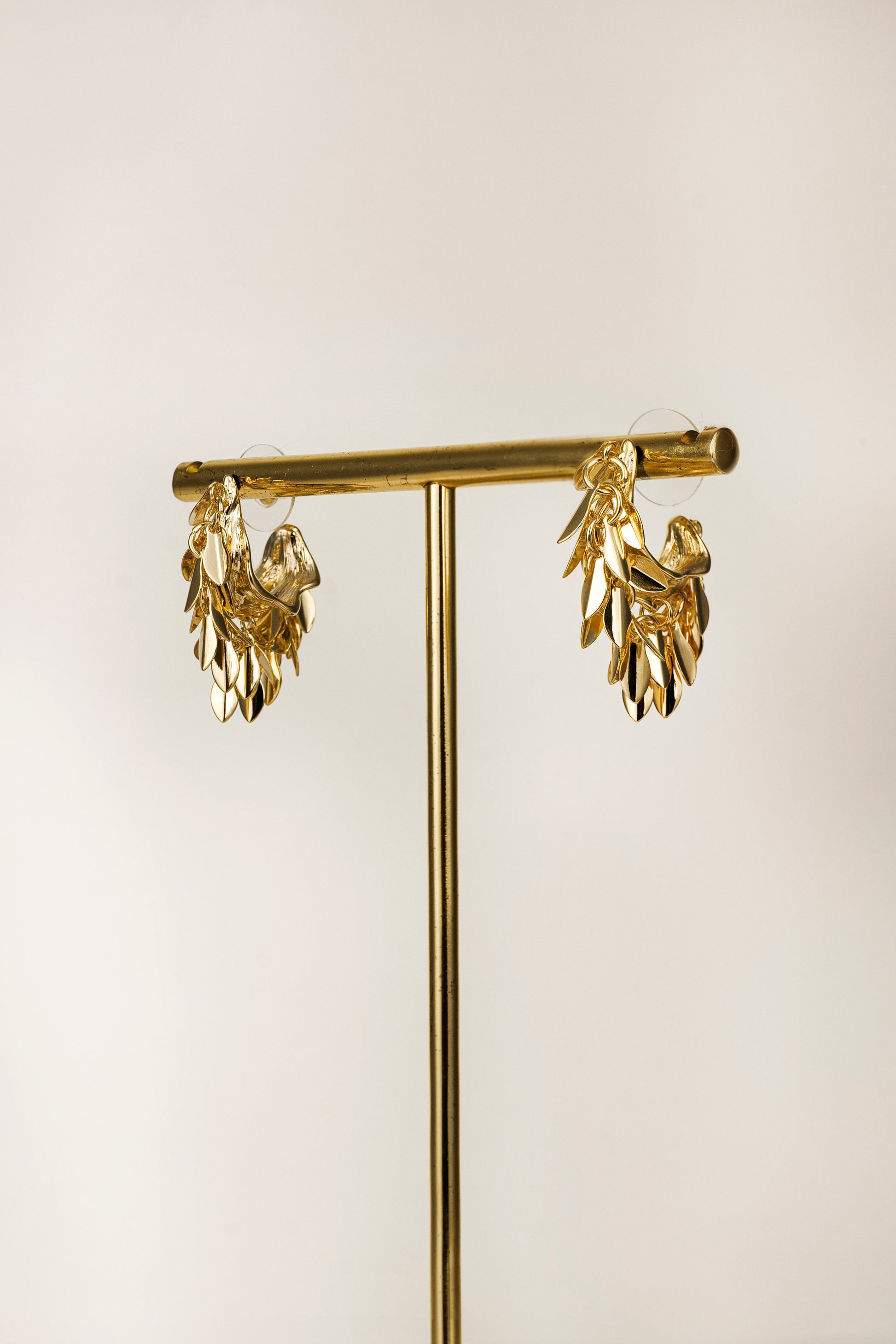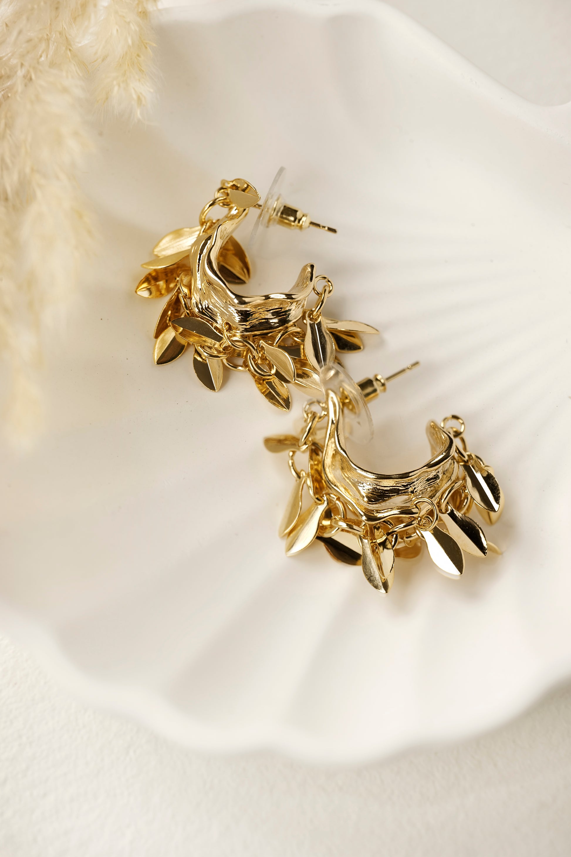 Chic hoop earrings adorned with dangling leaf charms, crafted from a brass base with an anti-tarnish finish.