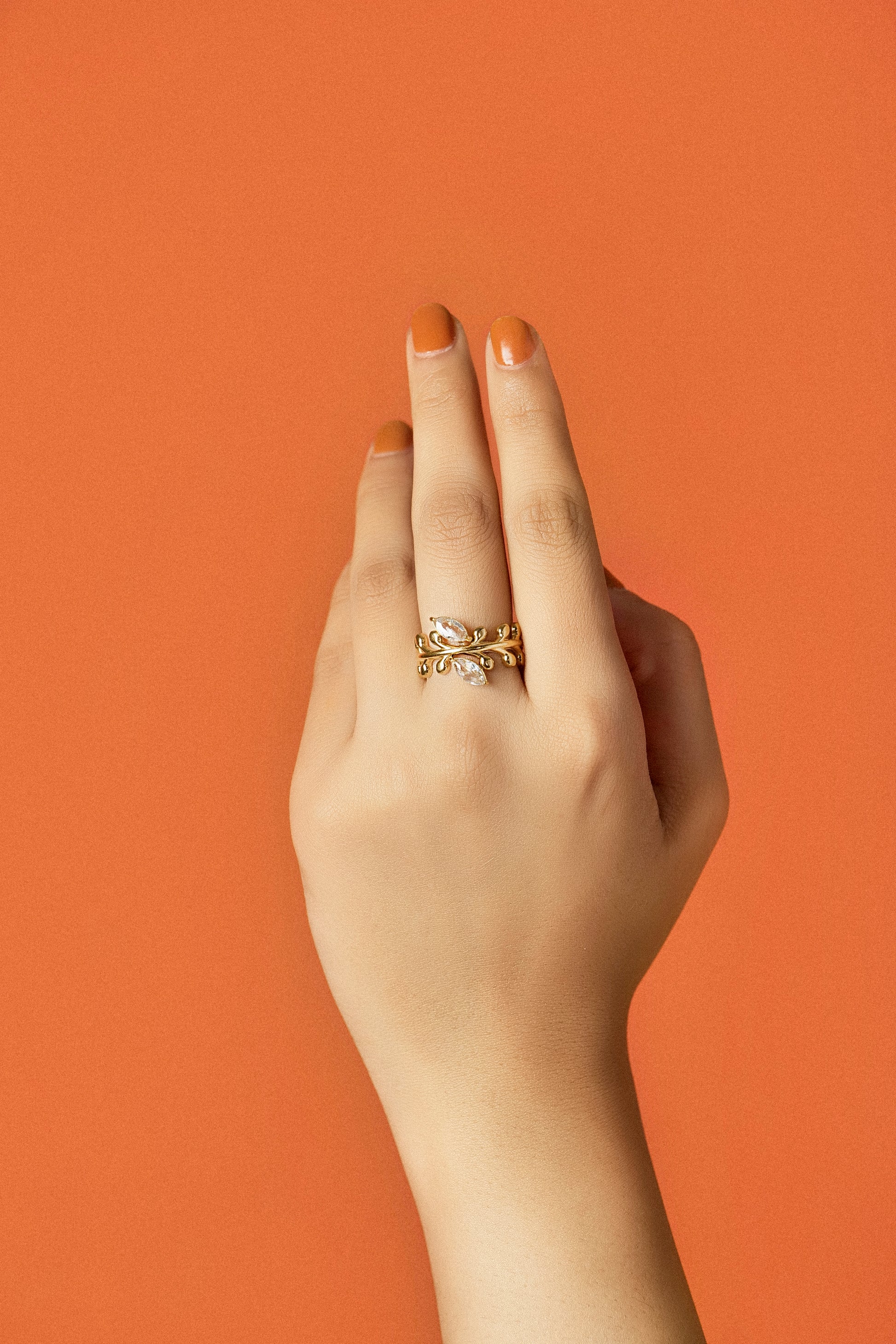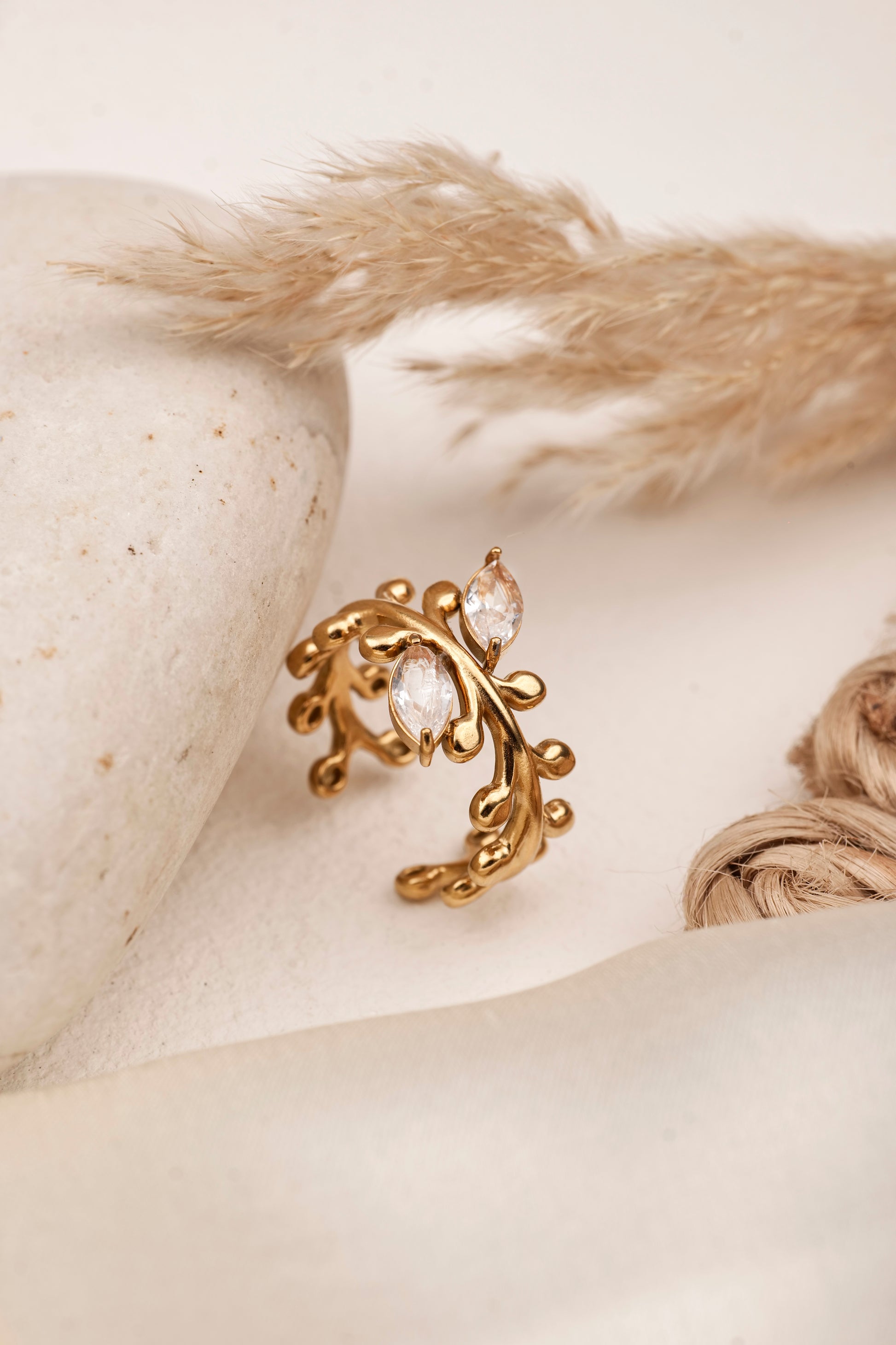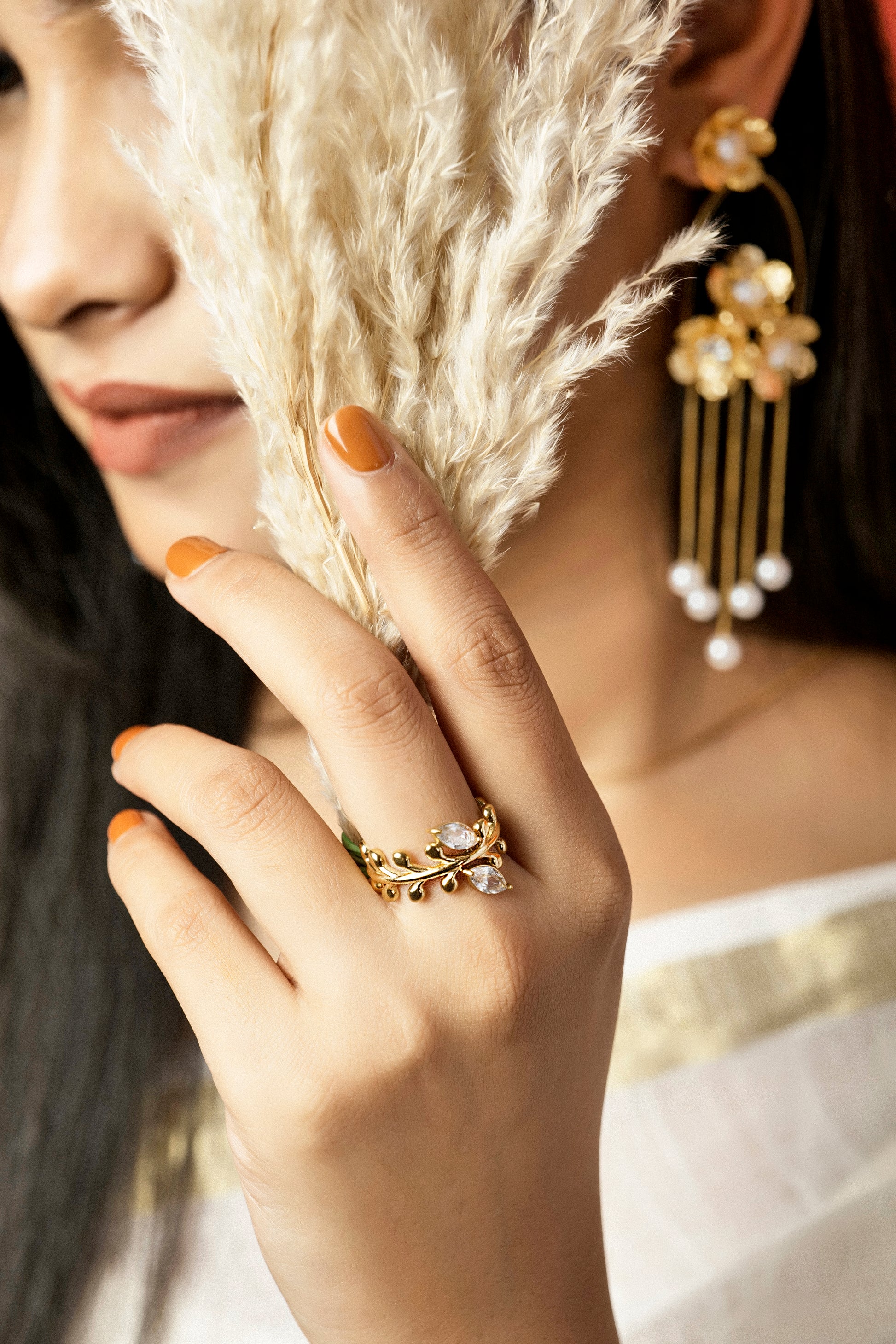 Made from a high-quality brass base with a waterproof coating, this elegant ring showcases marquise-cut cubic zirconia in a delicate floral-inspired arrangement. The golden beaded detailing along the band adds a vintage charm, making it perfect for both everyday elegance and special occasions.