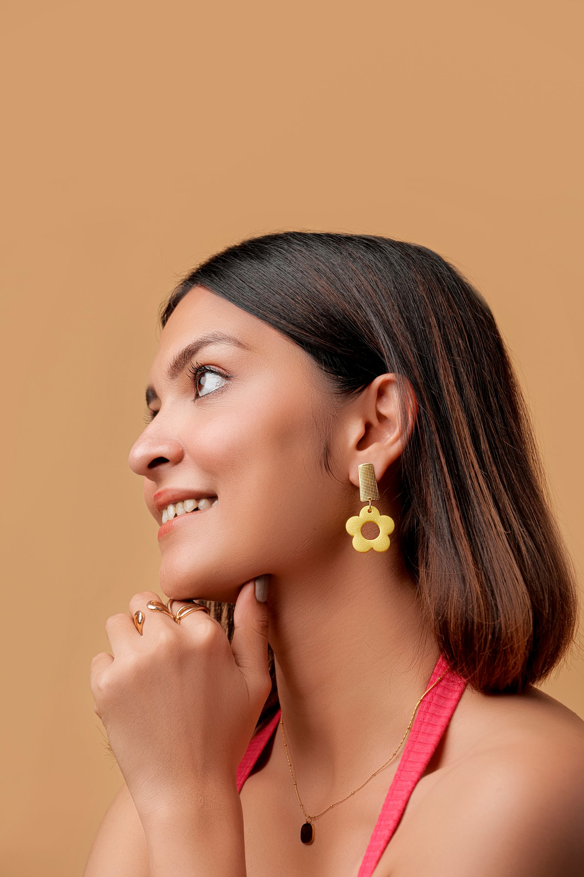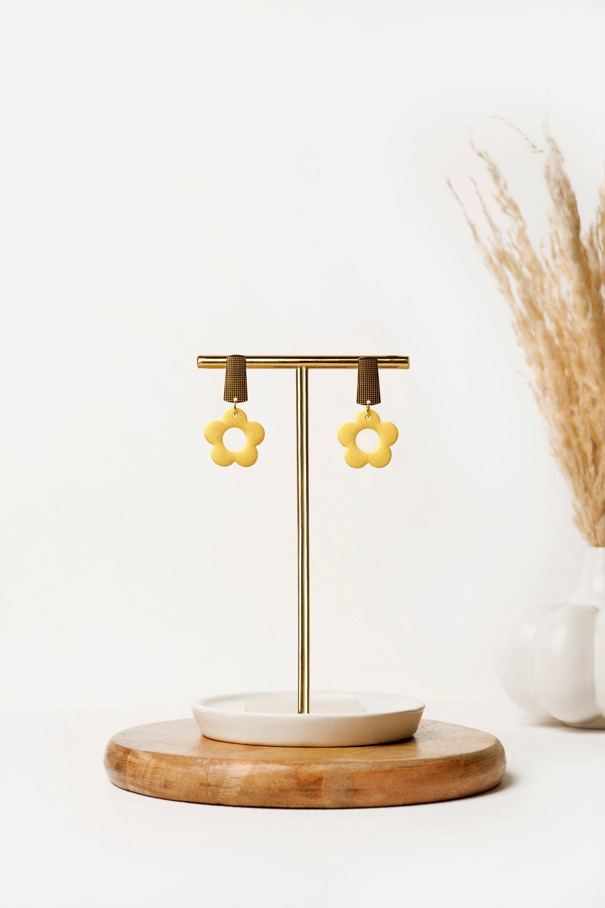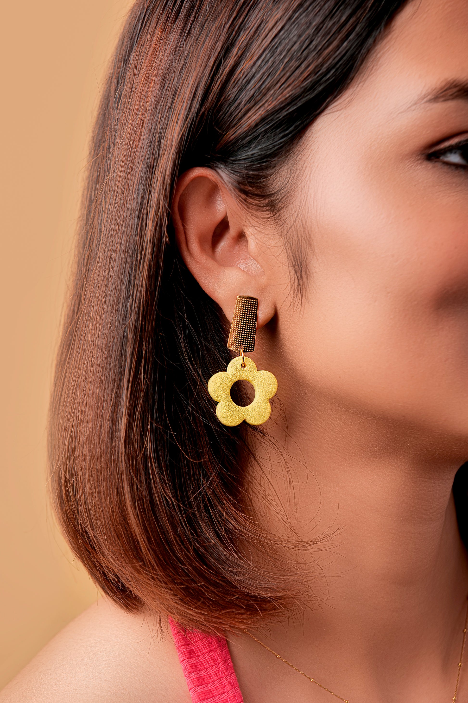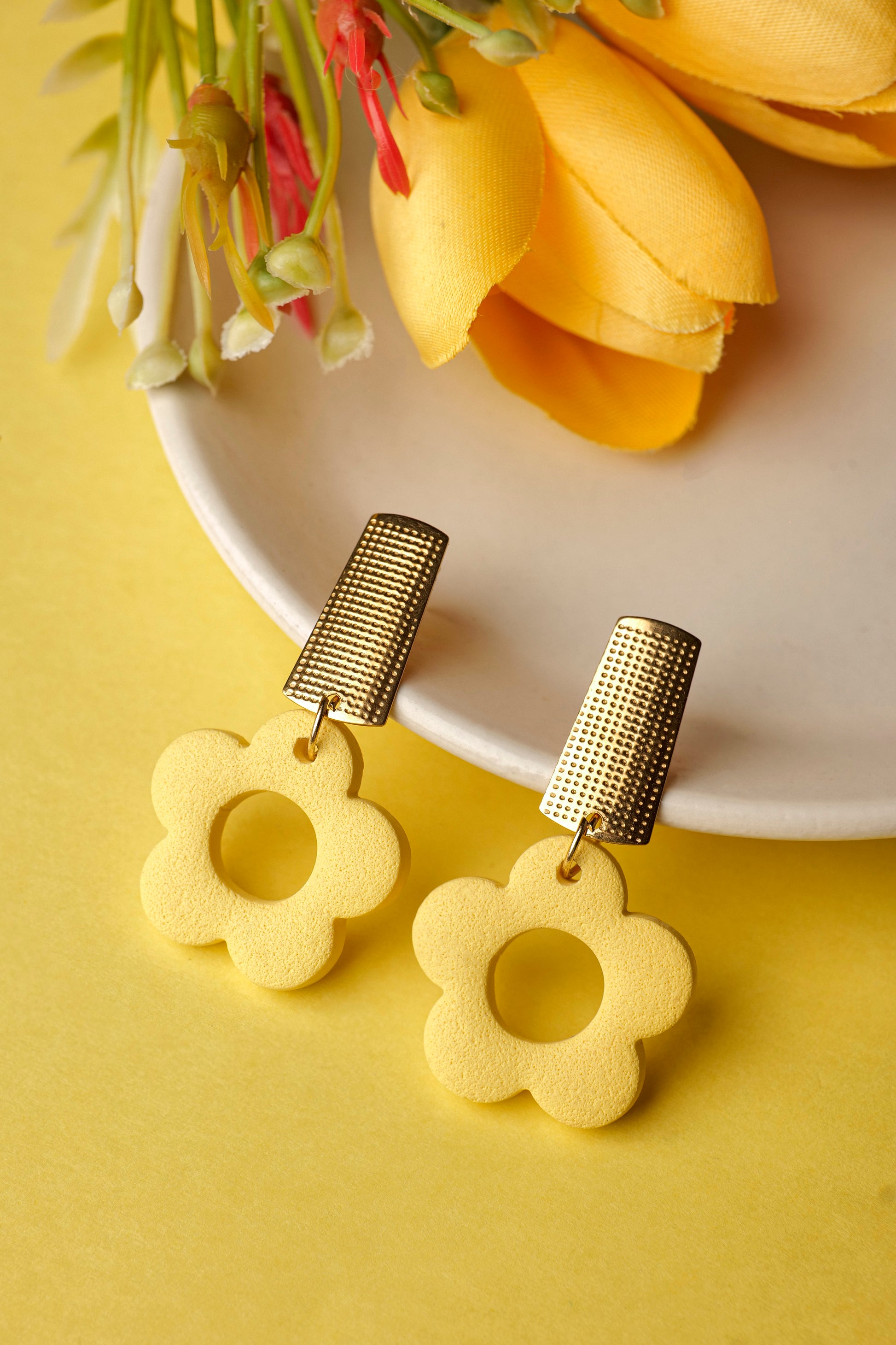 Say hello to your happy-go-lucky pair โ bright, playful, and full of sunshine. These cheerful daffodil-shaped earrings in a warm yellow hue are perfect to bring that instant pop of joy to your outfit. The sleek rectangular gold tops add a modern contrast to the soft floral shape, making them playful yet polished.