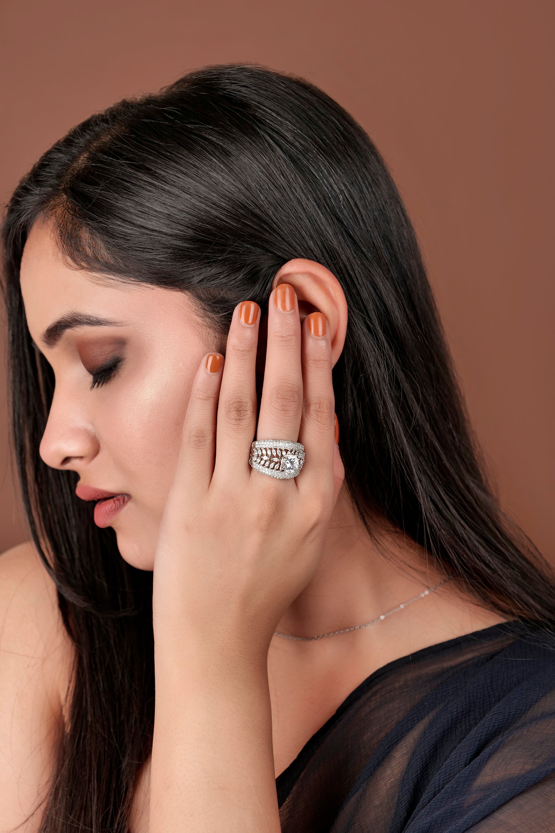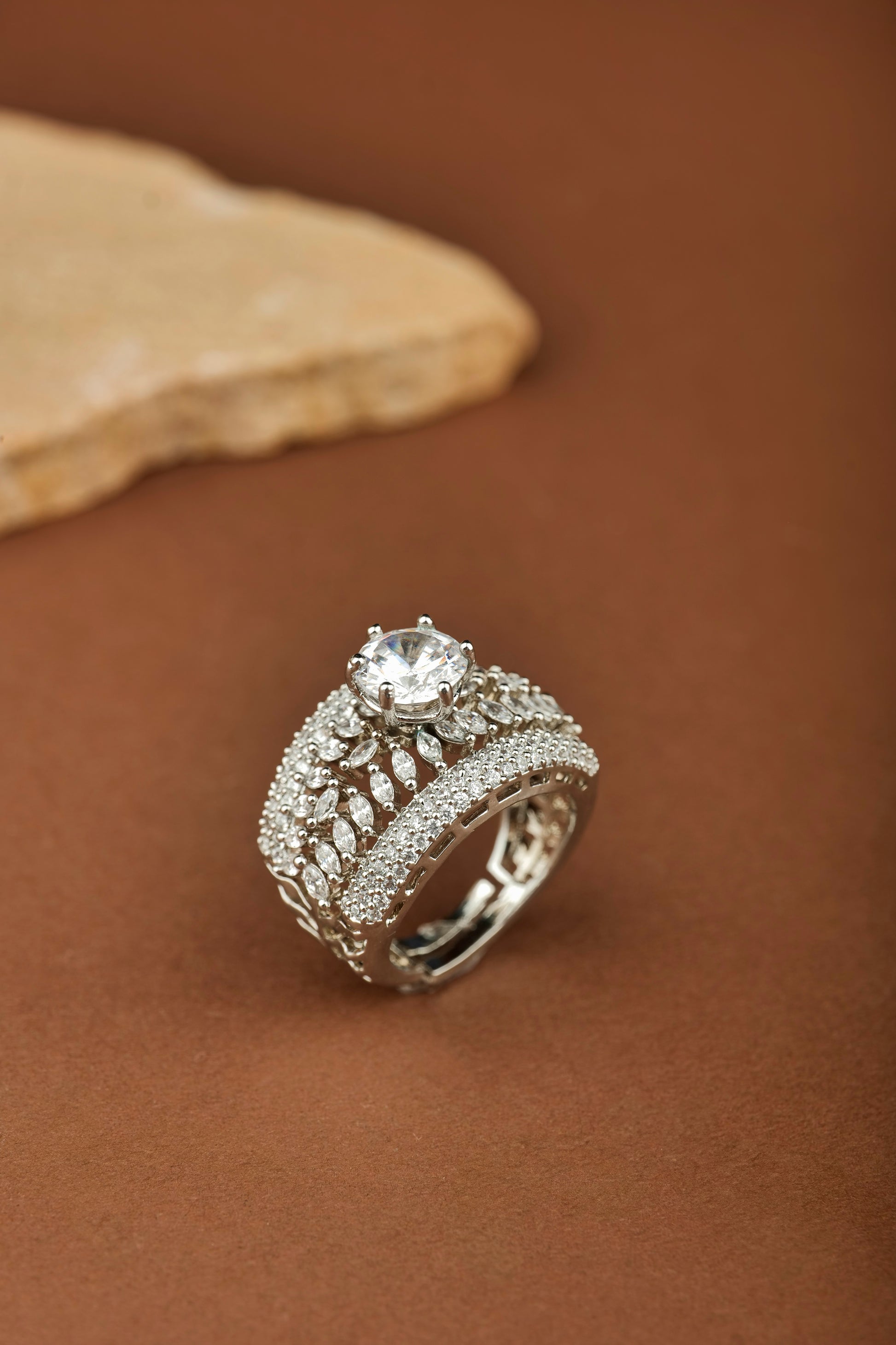 An elegant free-size adjustable ring featuring a brilliant round-cut American diamond centerpiece, flanked by rows of marquise-cut stones and micro-pavé detailing. Crafted from high-quality stainless steel, it is waterproof and anti-tarnish, ensuring lasting shine and durability.