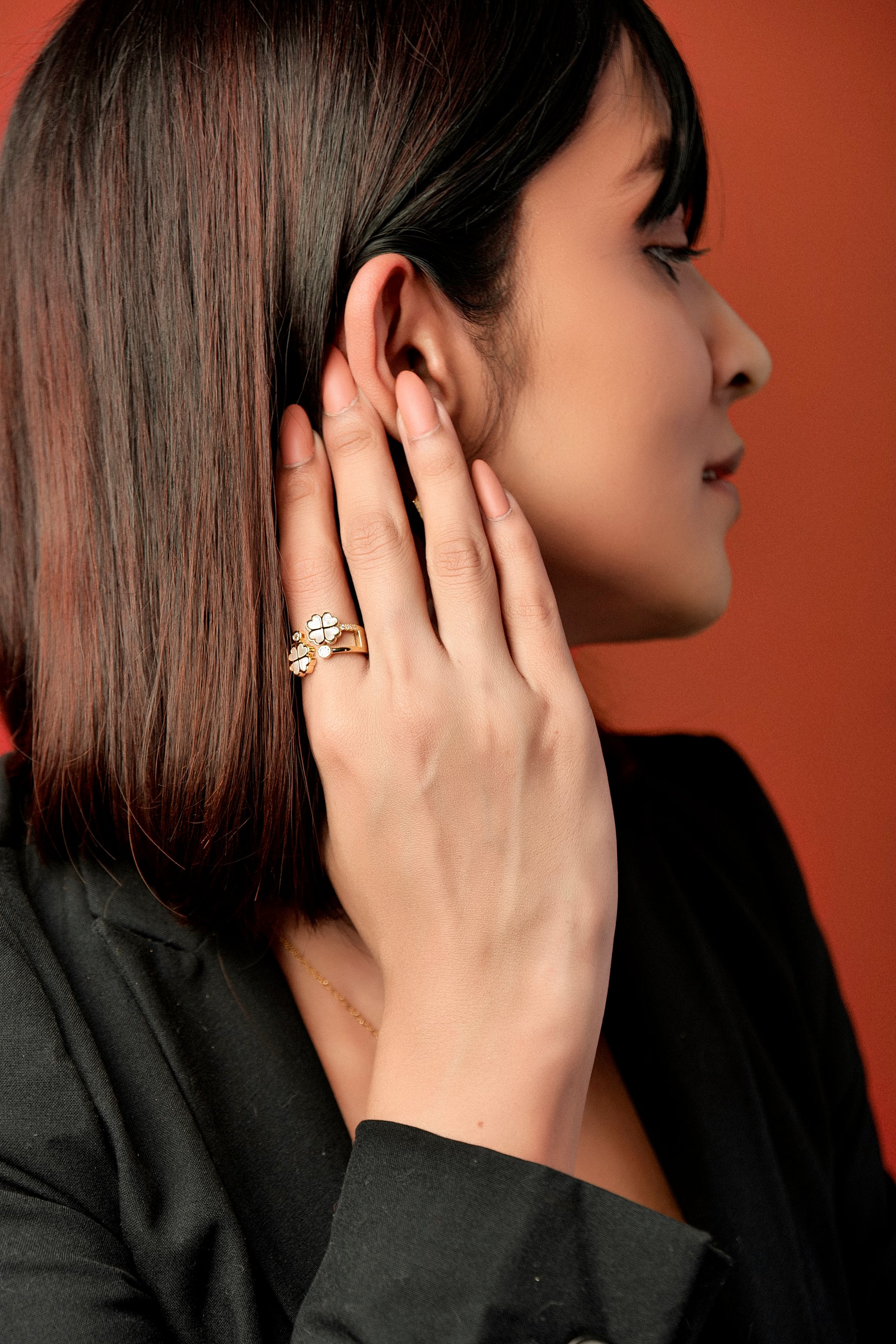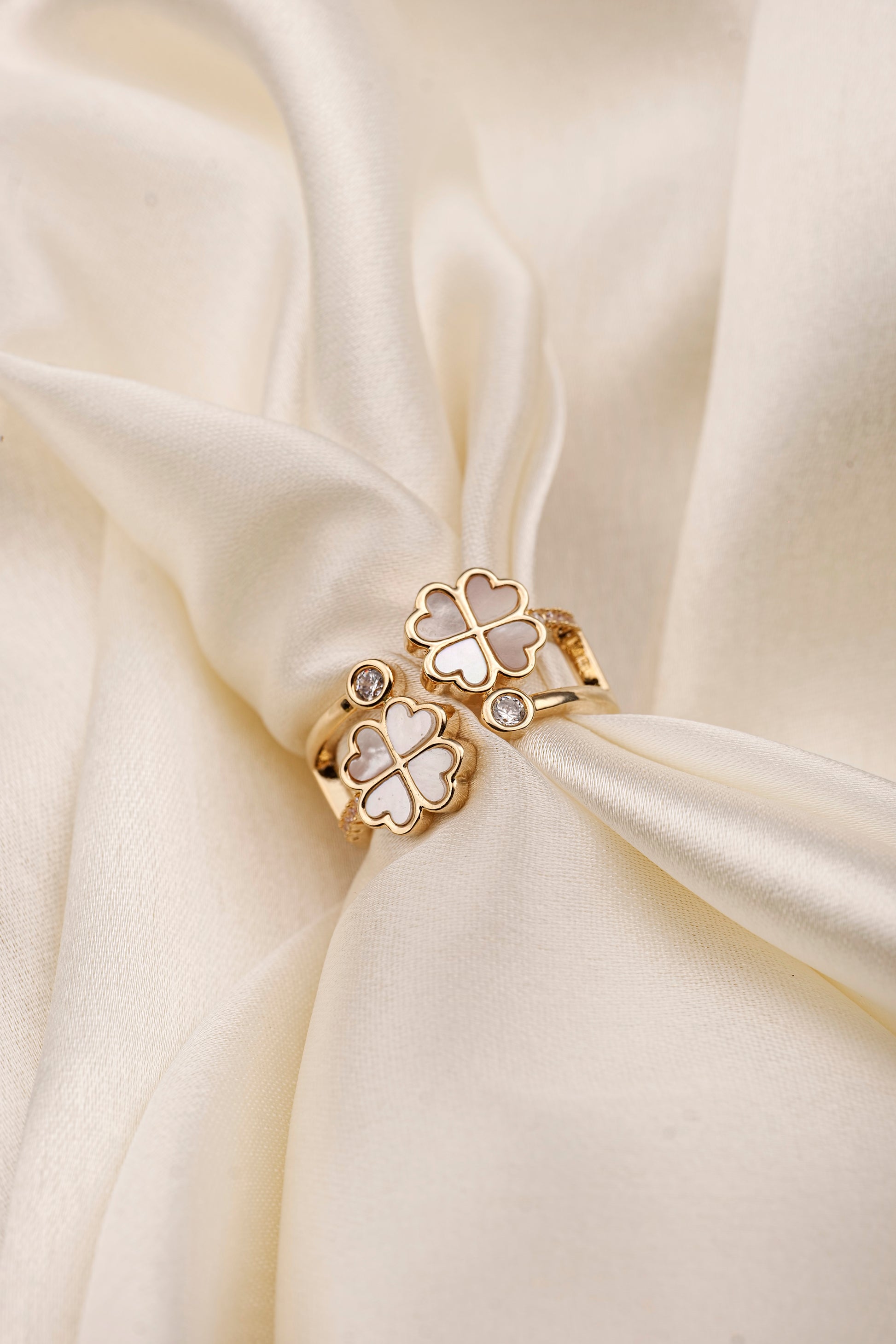 Crafted from a high-quality brass base, this waterproof adjustable ring features twin four-leaf clover motifs inlaid with delicate white enamel, accented by sparkling cubic zirconia stones. Designed for everyday elegance, it brings a touch of charm and sophistication to any look.