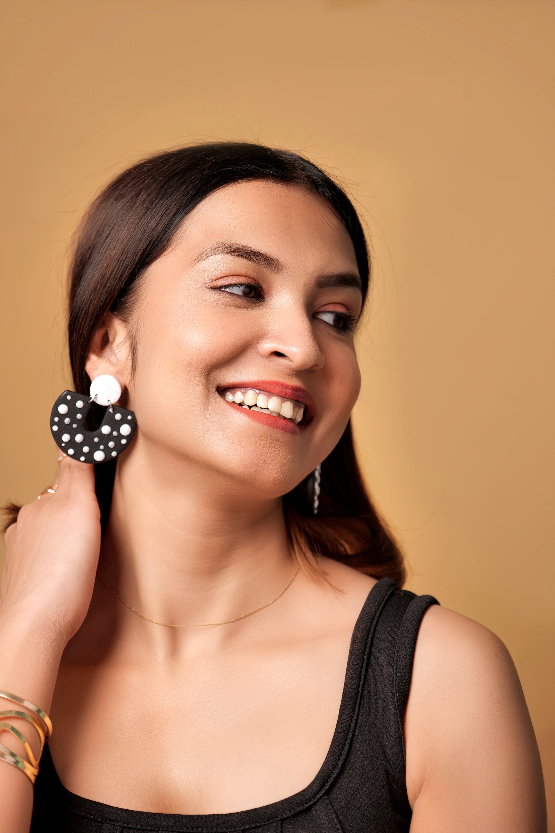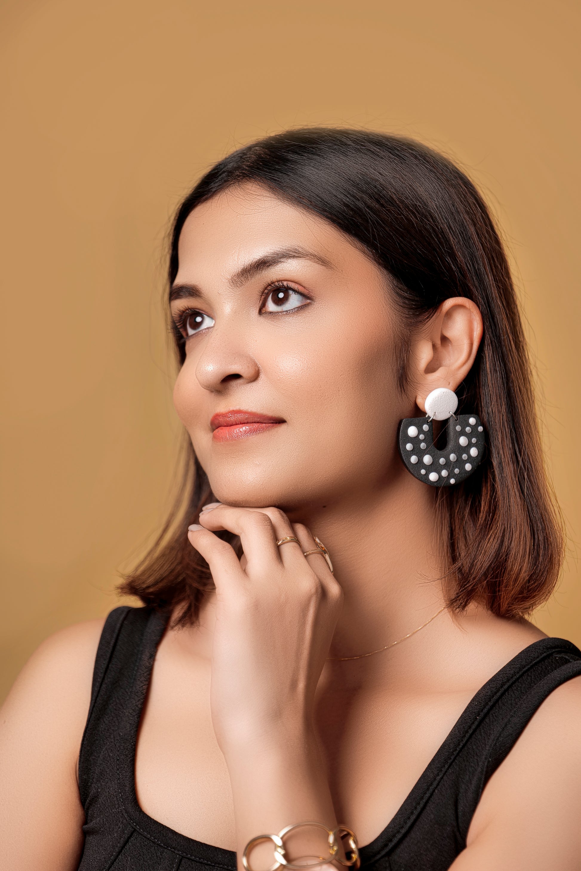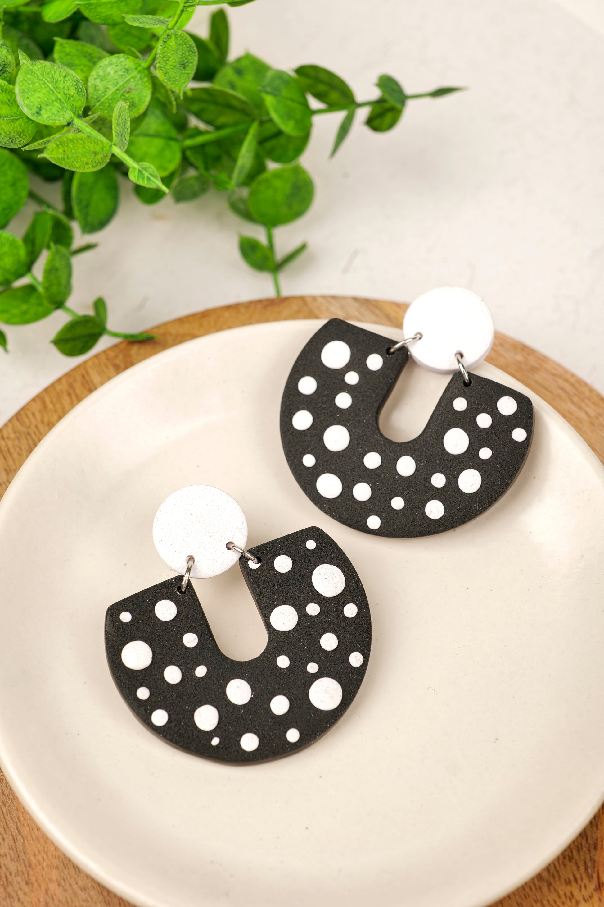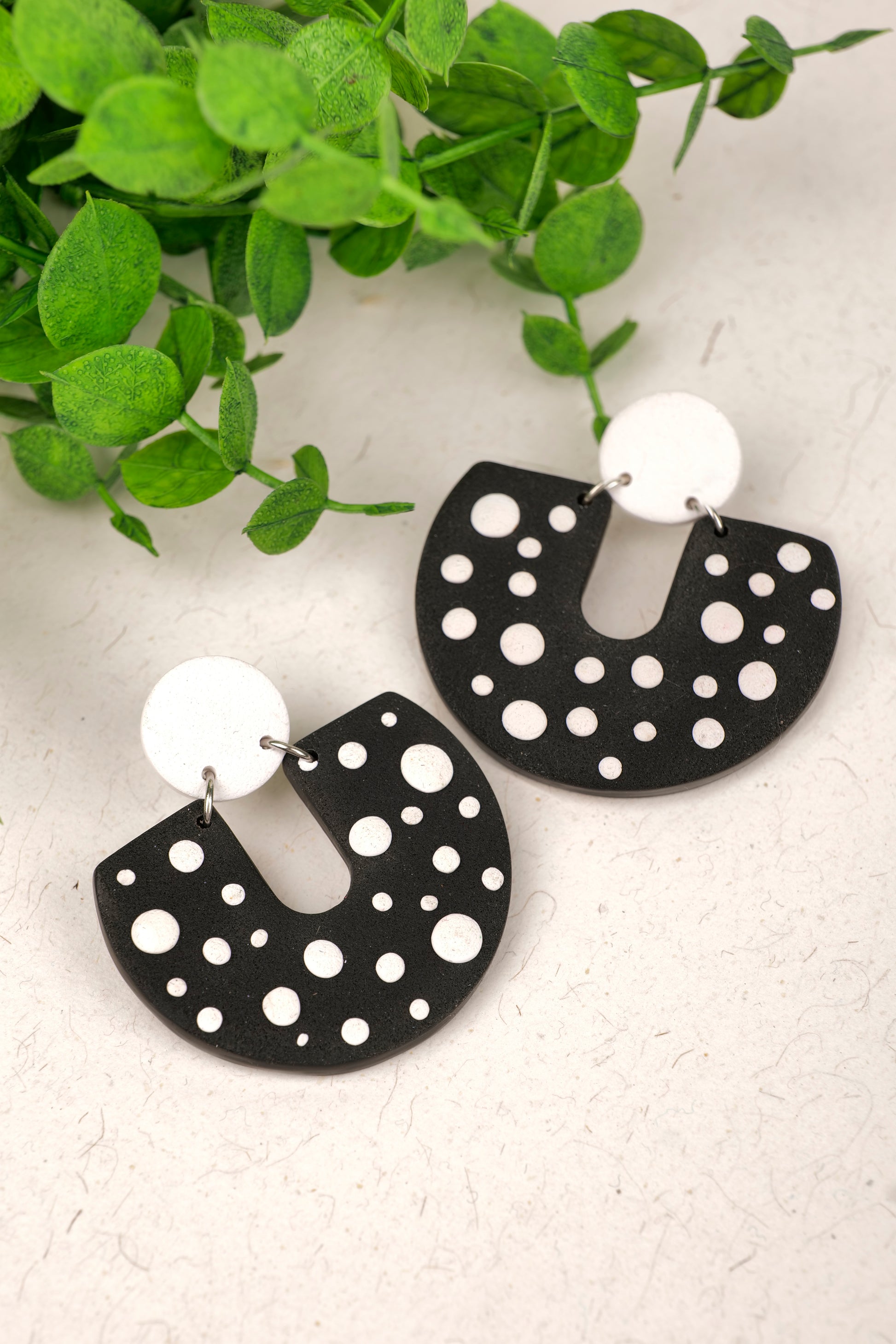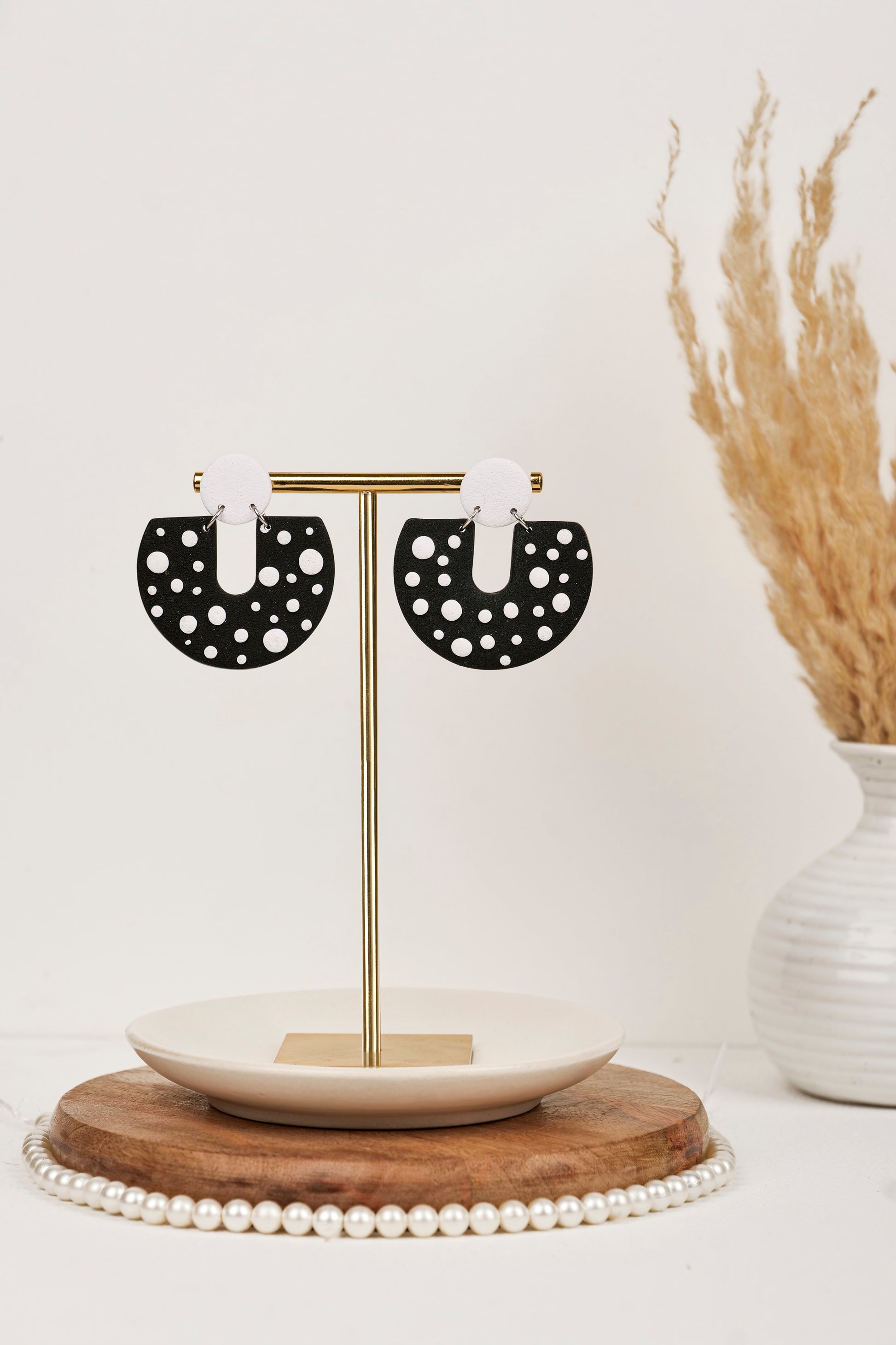 This pair has a bold, modern half-moon shape with playful white polka dot accents on a black base, paired with a white stud. The design is fun, artistic, and chic!
