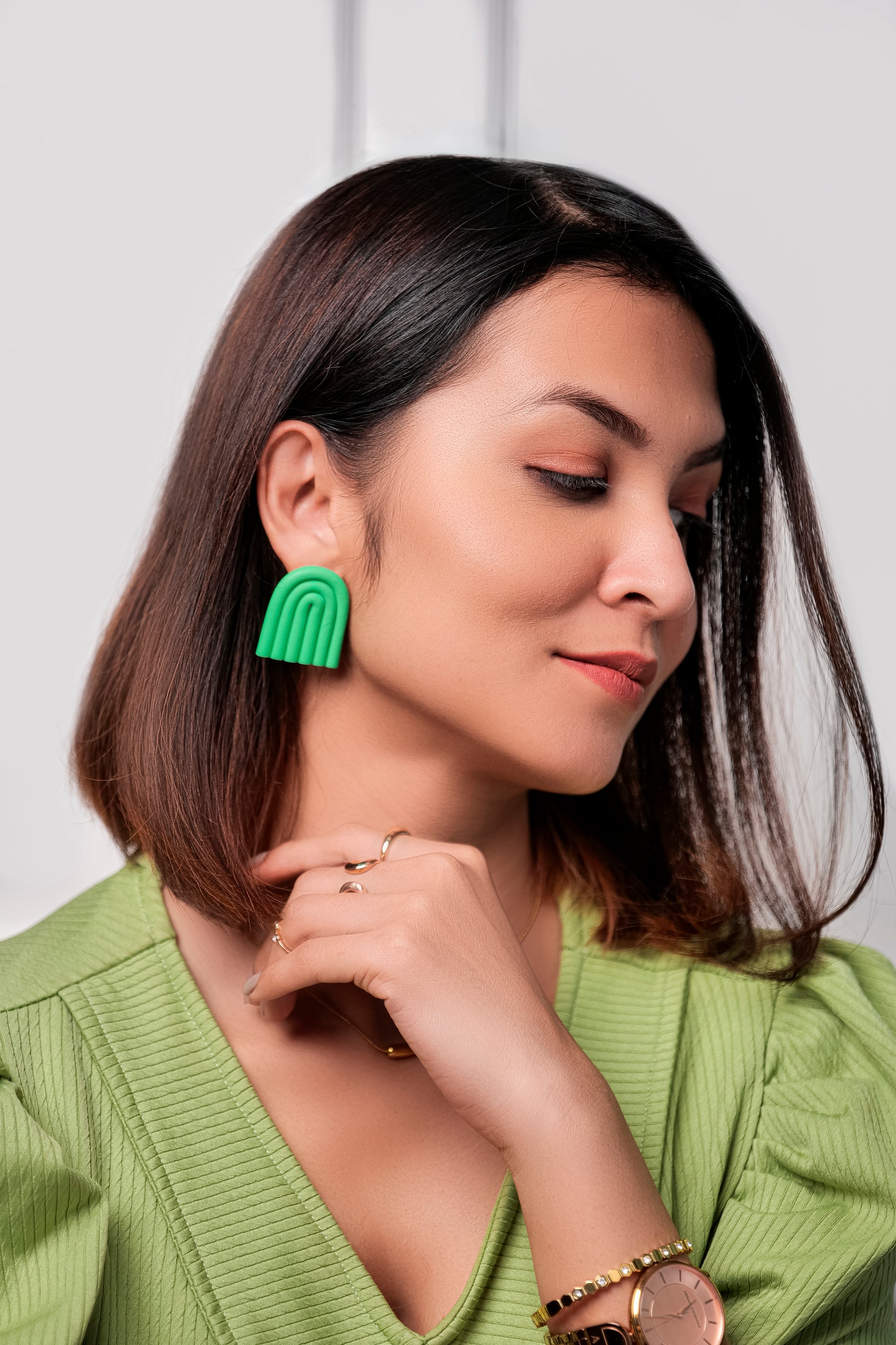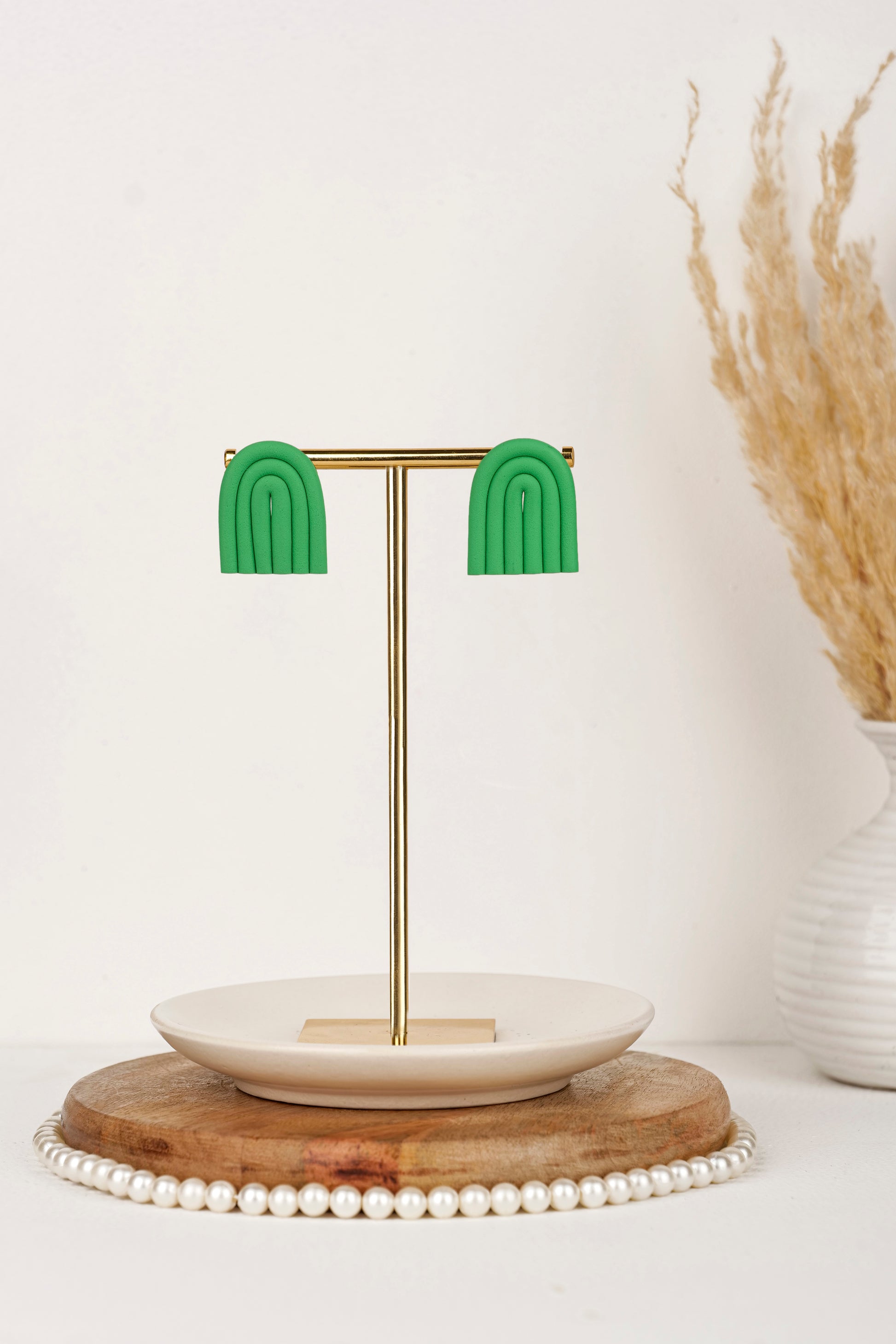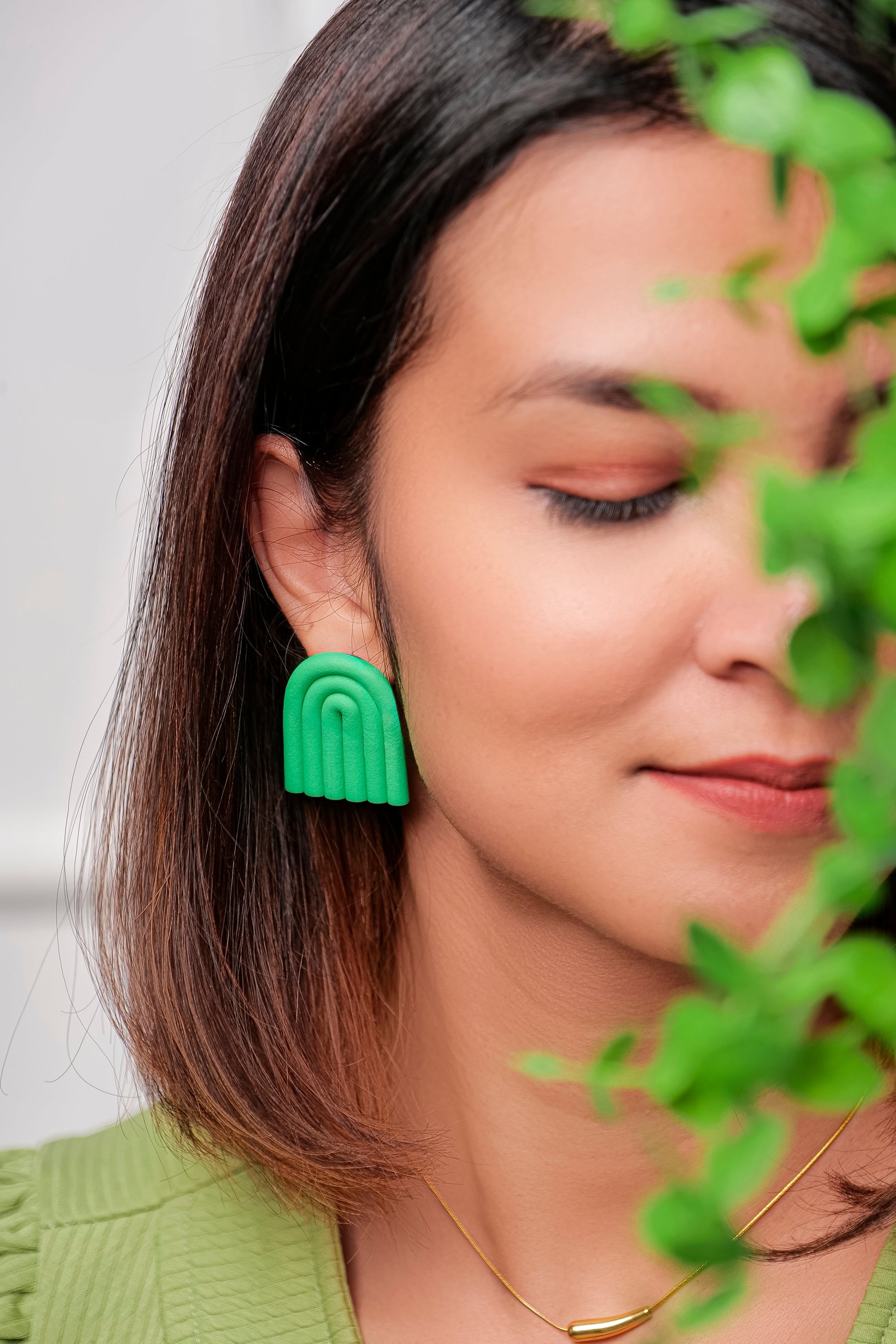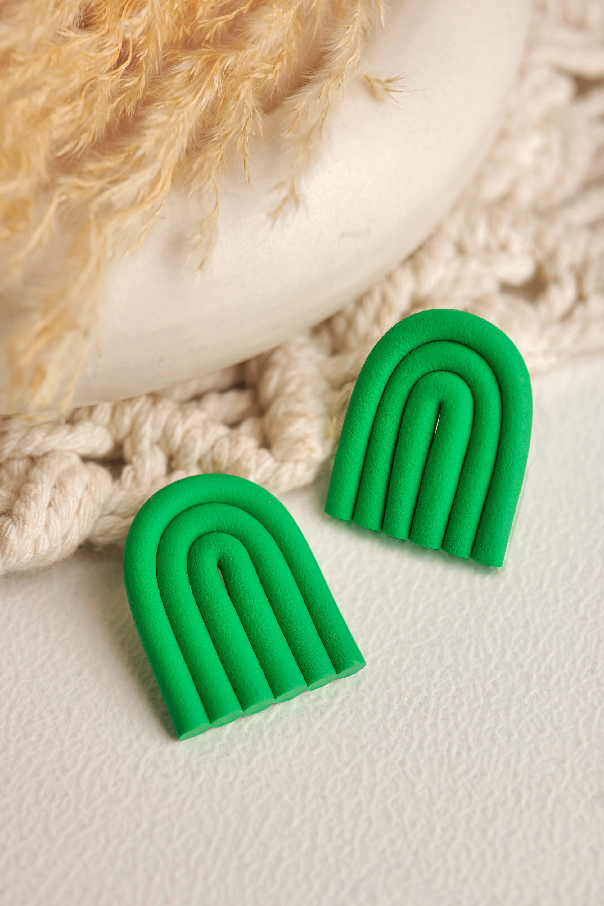 A fresh pop of green, these polymer clay earrings feature a smooth triple-arch design that adds movement and modern charm to your look. Minimal yet bold, they're a statement in earthy elegance โ handcrafted with care and intention.