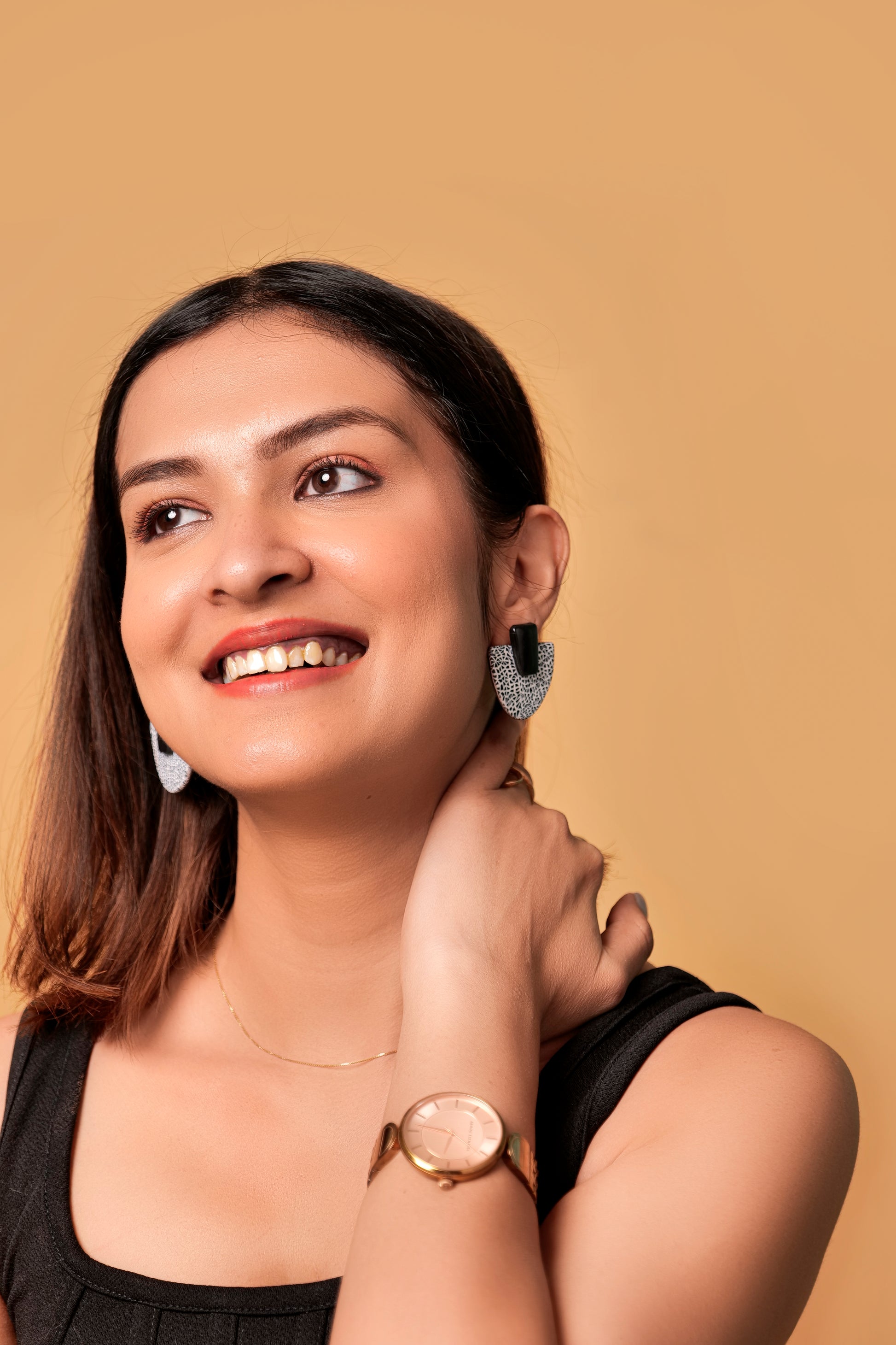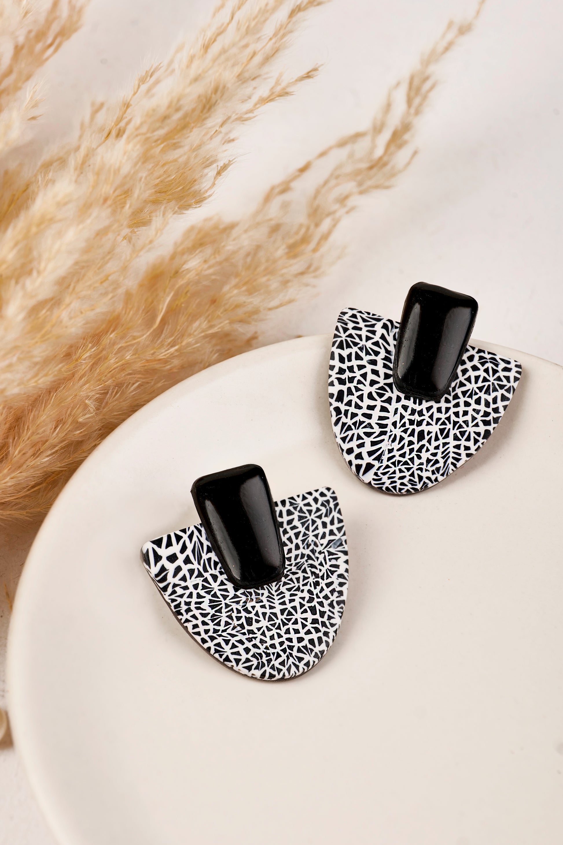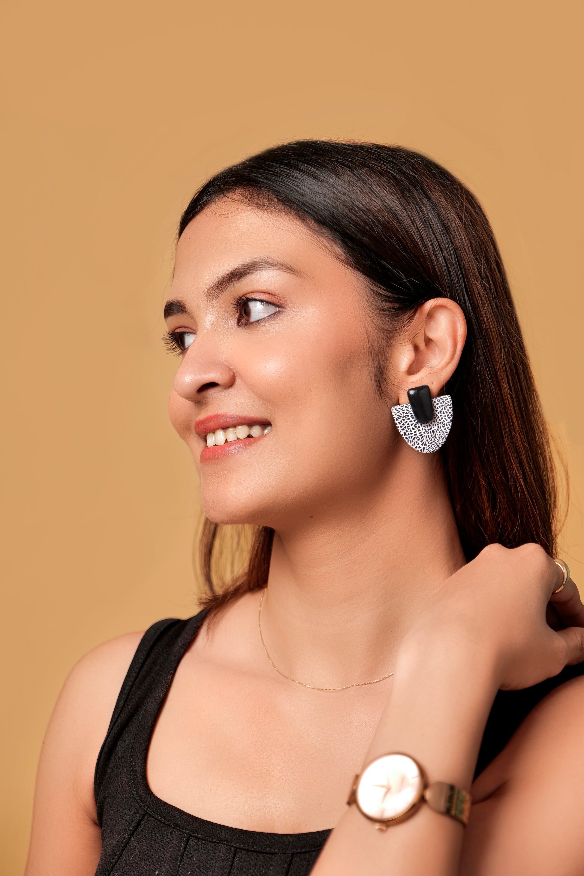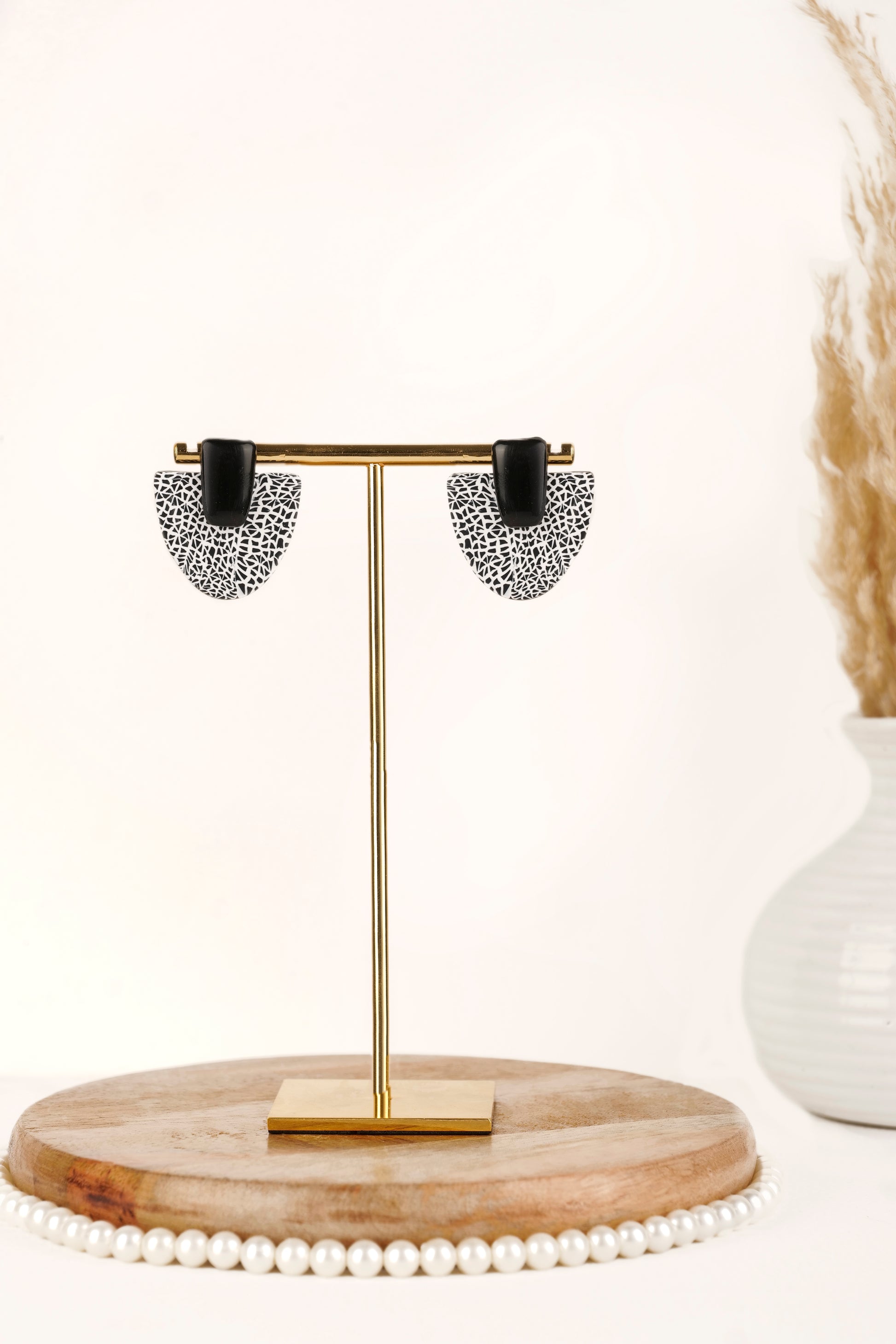 Bold yet minimal, these black-and-white half-moon earrings feature a speckled pattern and sleek black top. Handcrafted for everyday elegance with an artsy twist.