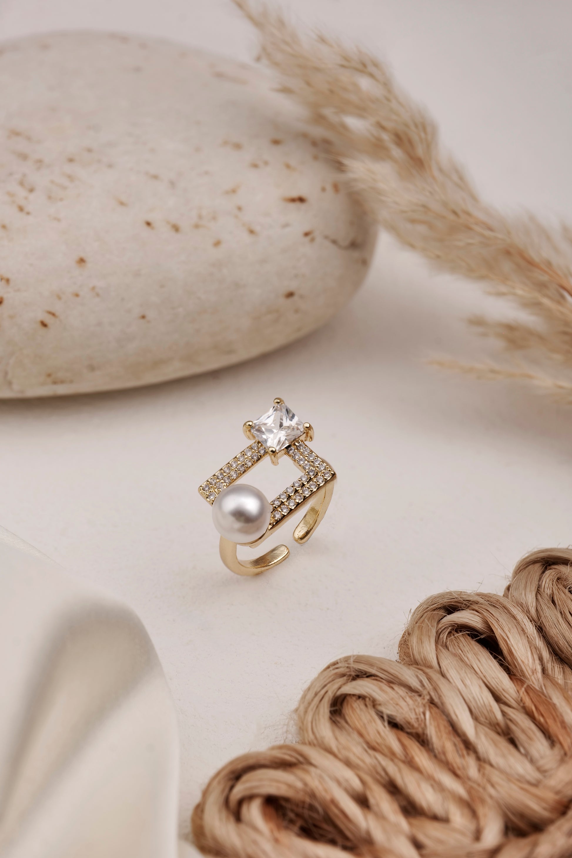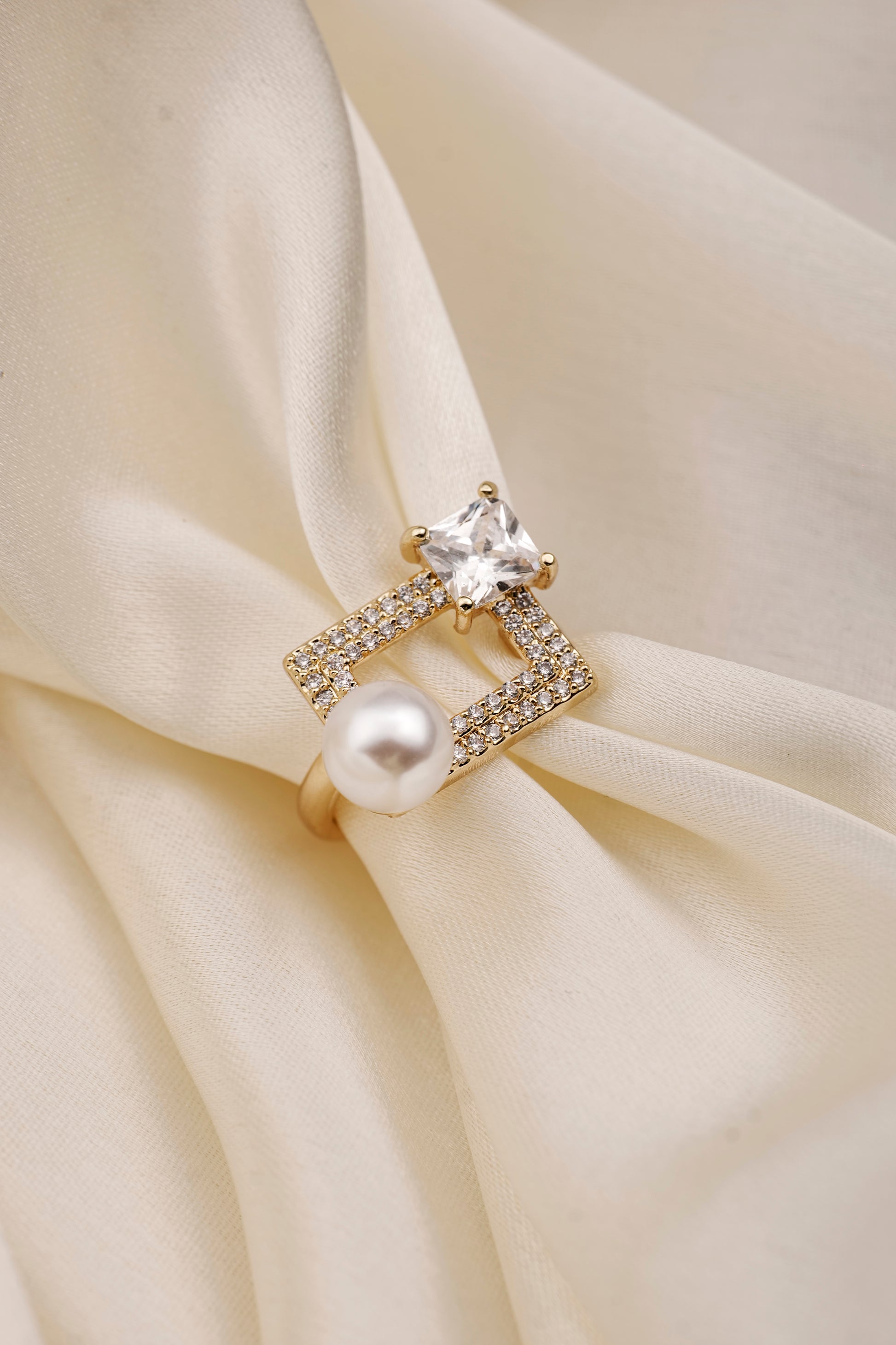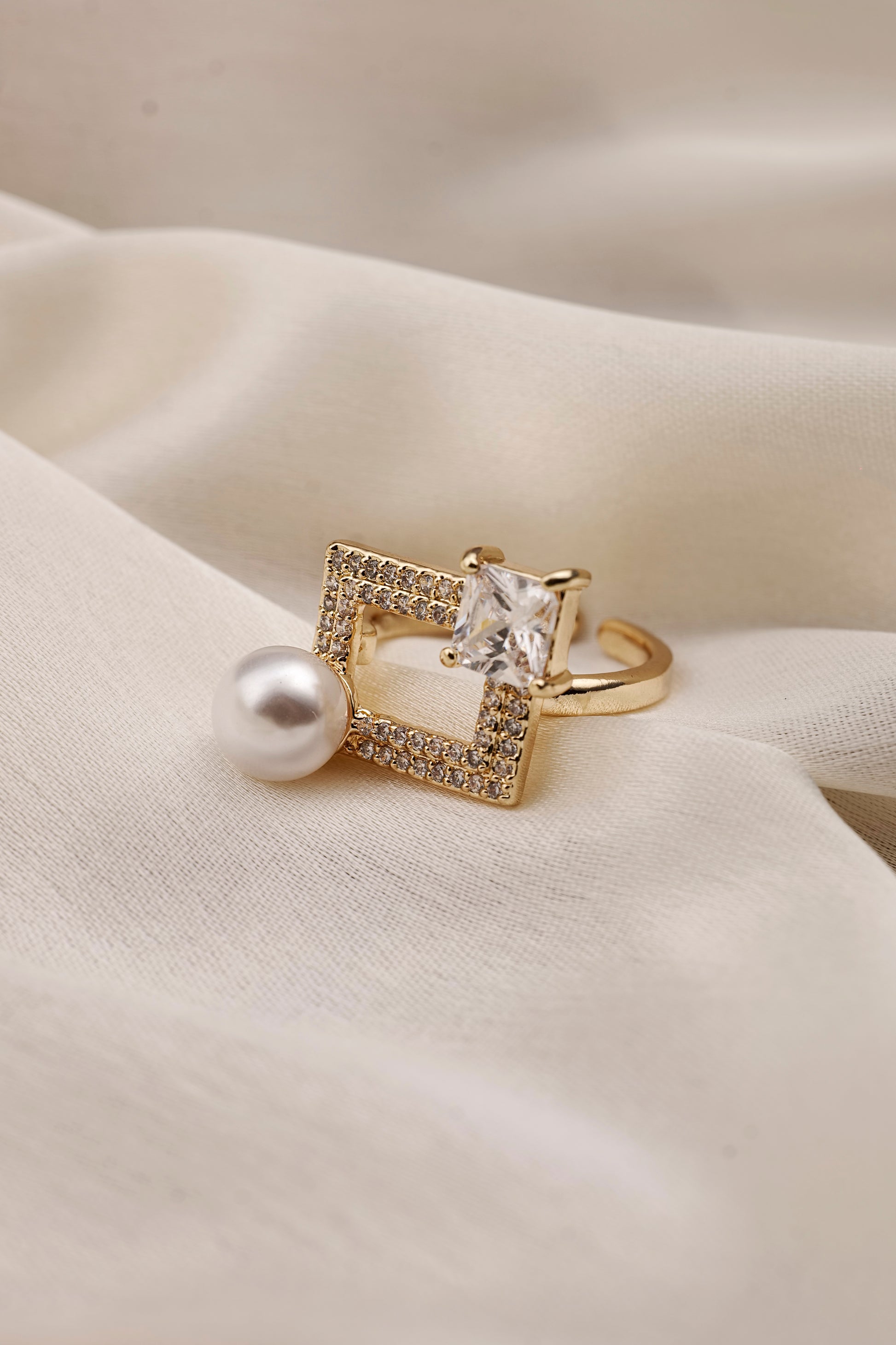 A contemporary brass-based gold-tone adjustable ring featuring a square crystal-studded frame, accented with a lustrous pearl on one corner and a brilliant princess-cut stone on the other. This chic combination of geometric design and classic elegance makes it a statement piece for any look.