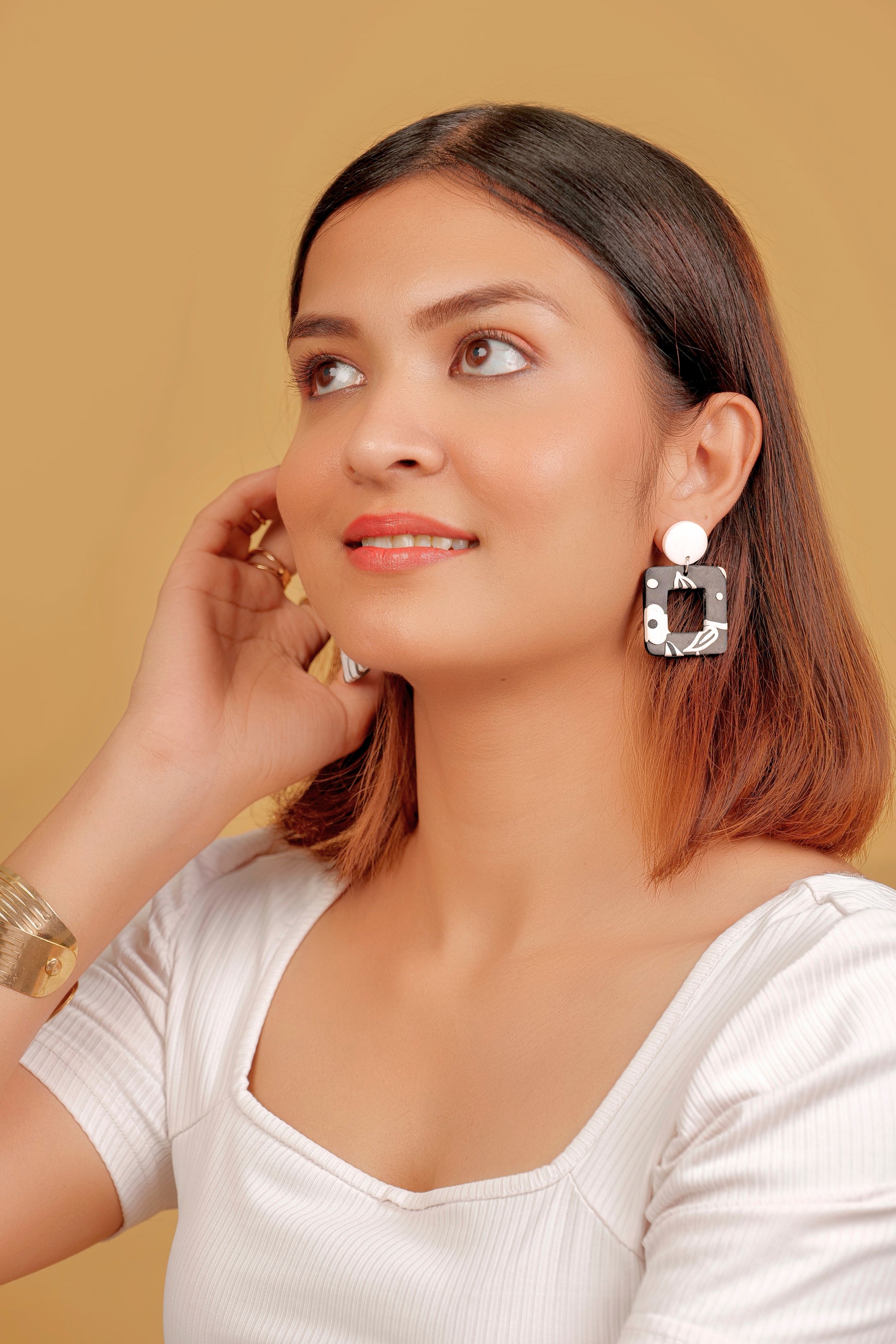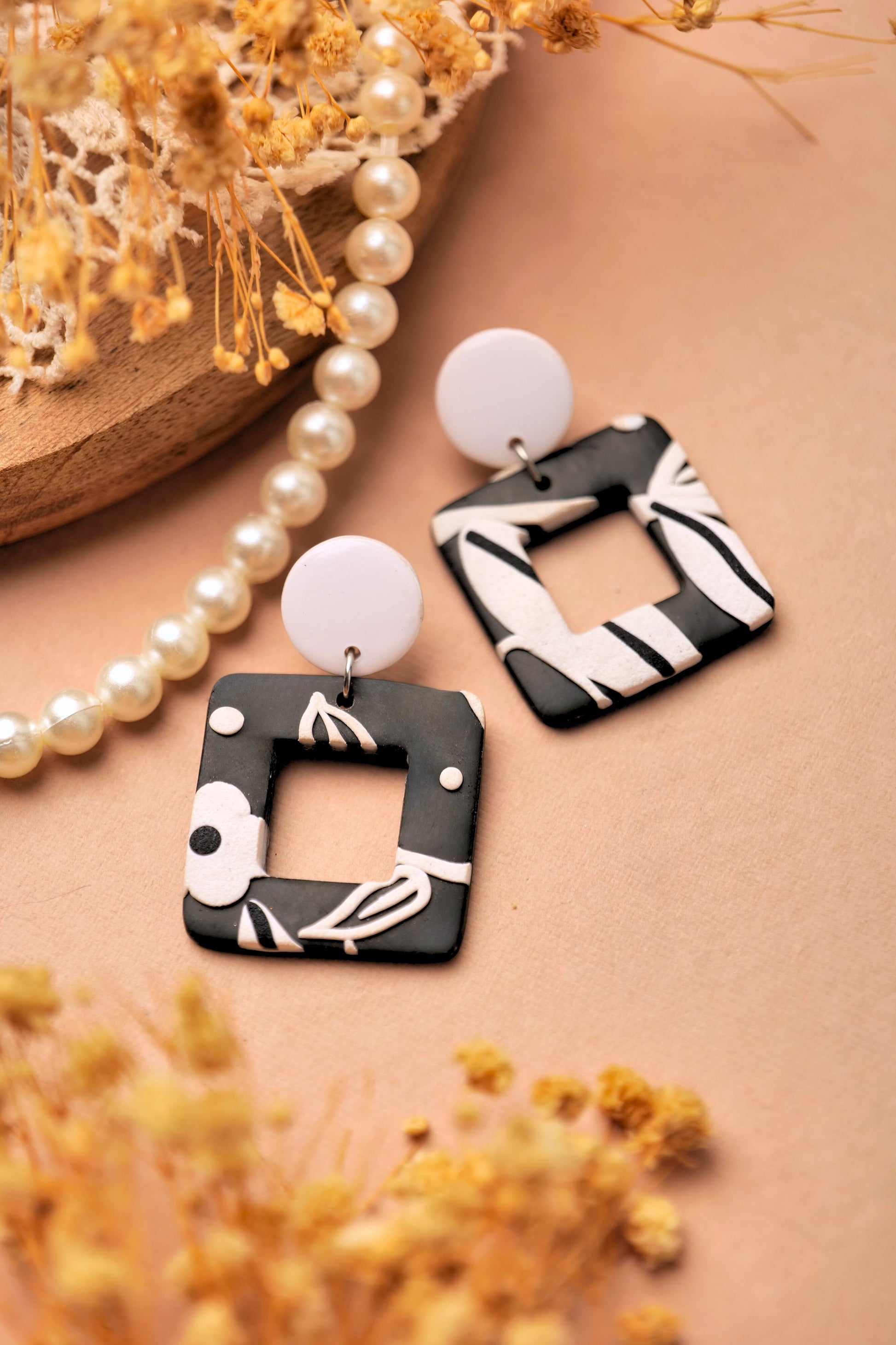 Mono Bloom is where modern structure meets soft floral detail. This statement square earring balances bold edges with gentle botanical patterns in black and off-white, making it a chic yet wearable piece for your everyday wardrobe.