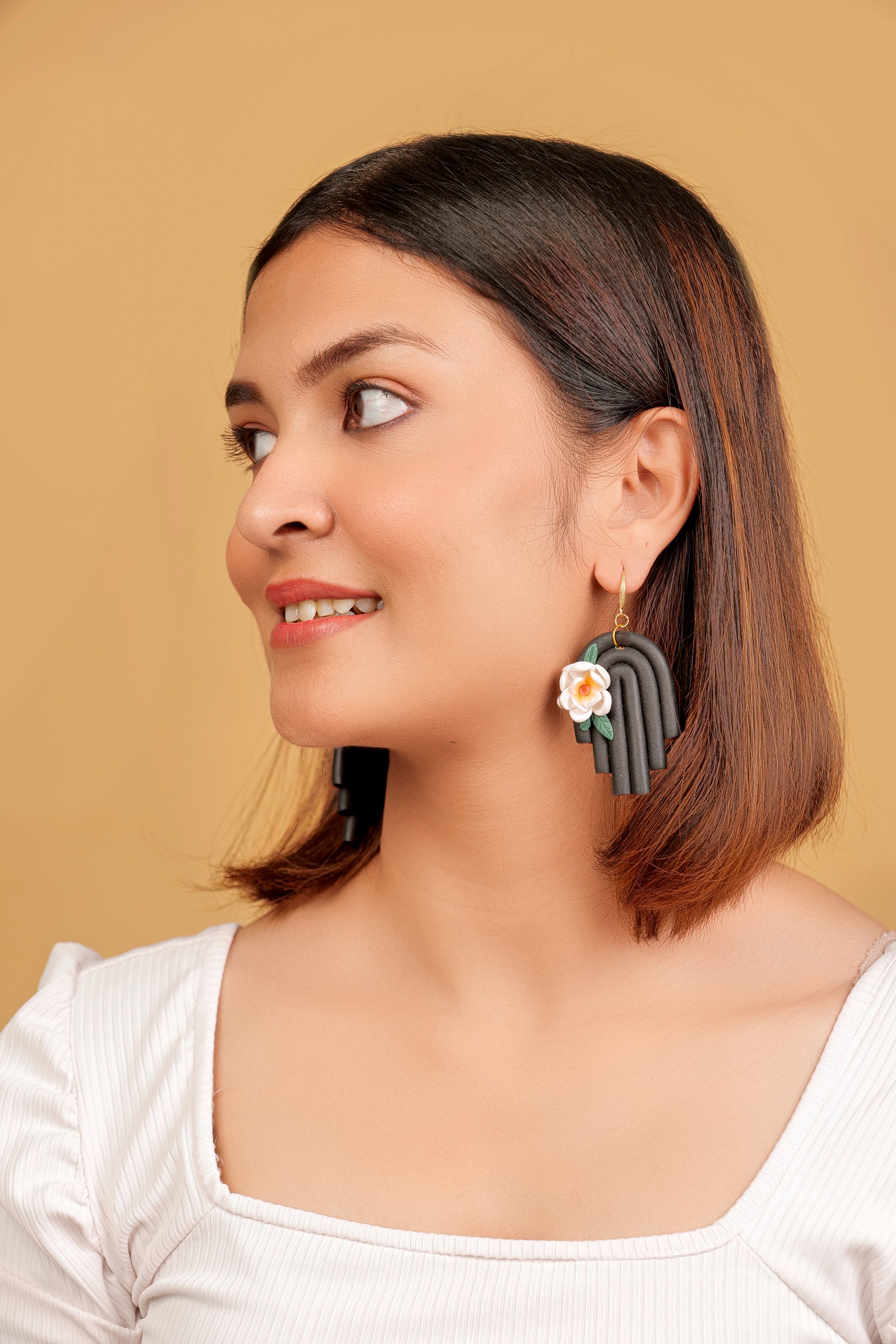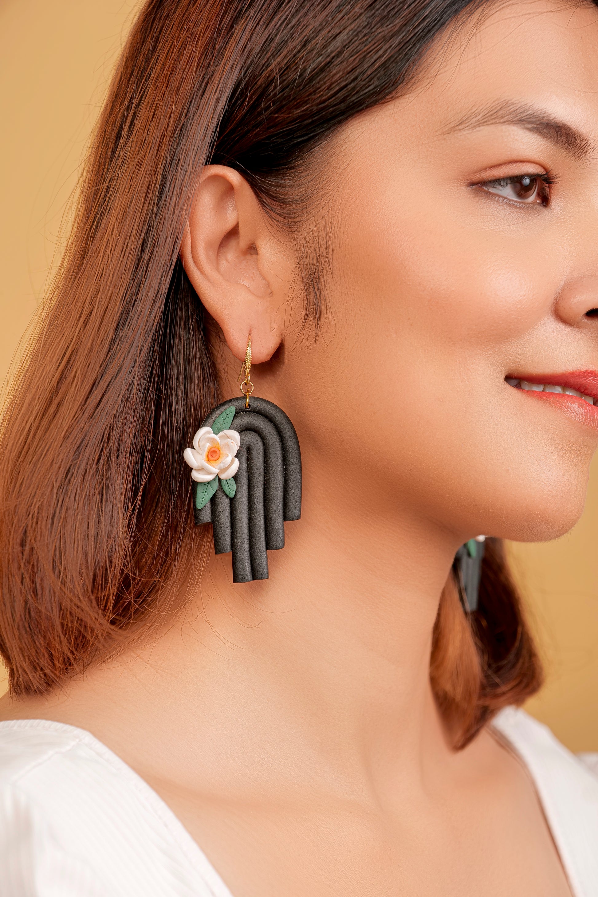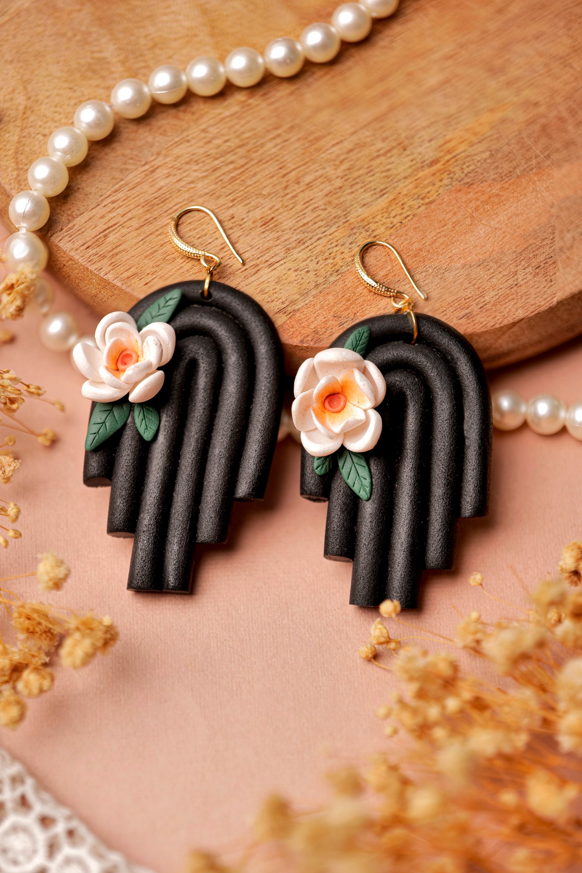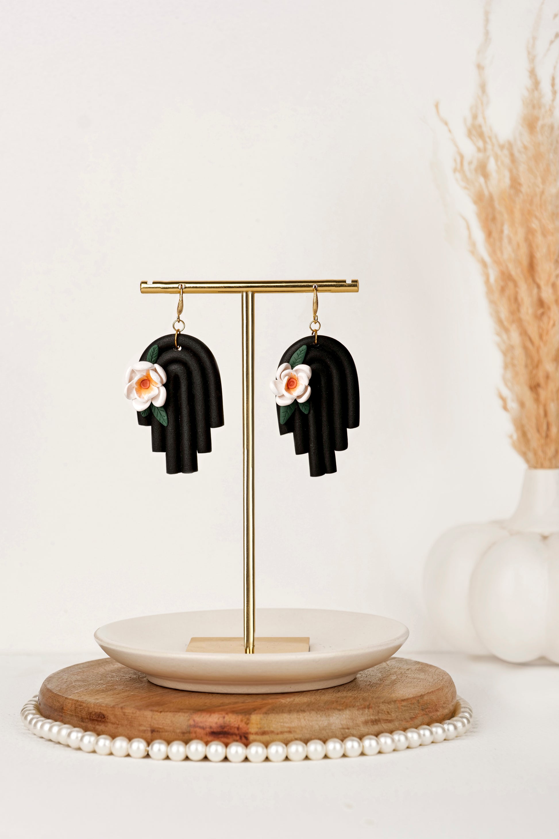 Sculpted in a bold arched form, these black polymer clay earrings feature delicately layered white floral motifs.